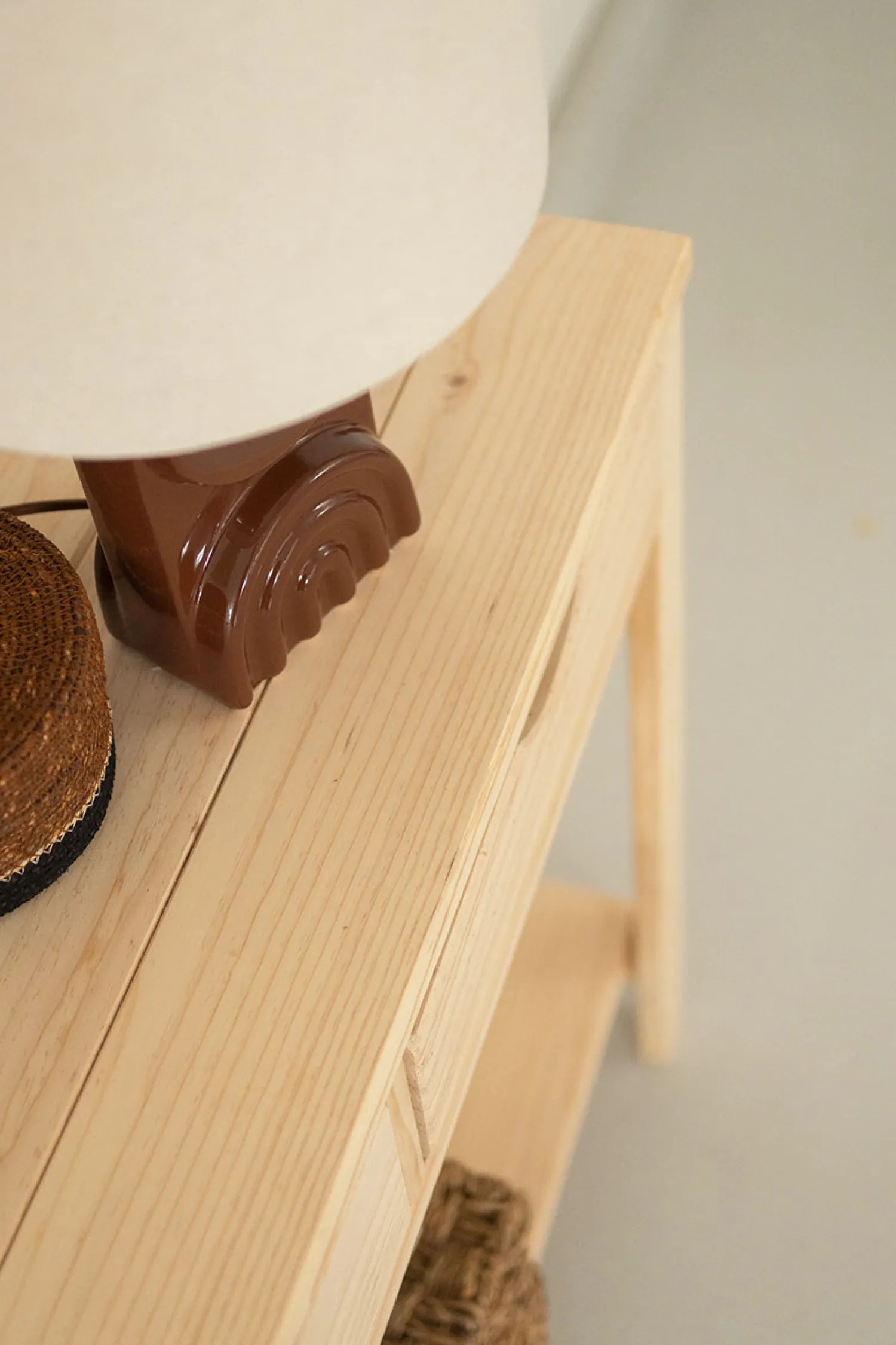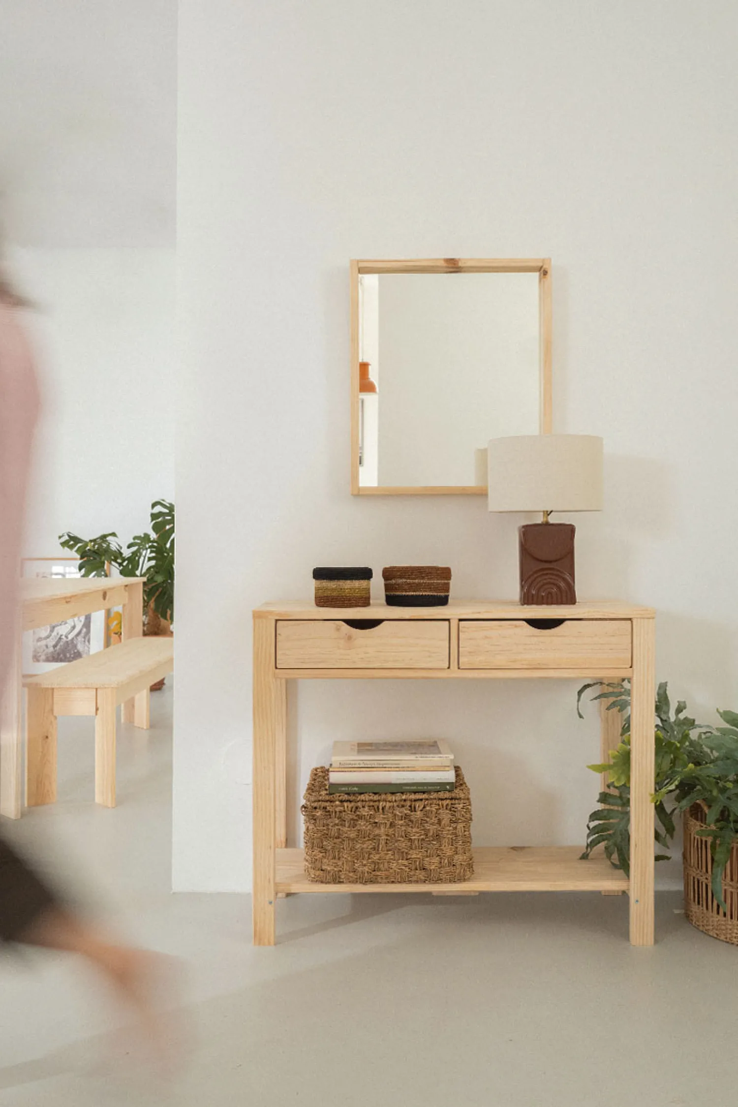 Consola de madera de pino maciza y certificada, perfecta para entradas o pasillos. Sus dos cajones y su balda inferior ofrecen espacio extra para mantener el orden, sin renunciar a la ligereza visual. Un mueble funcional y cálido, con ese estilo sencillo que encaja en cualquier rincón de la casa.