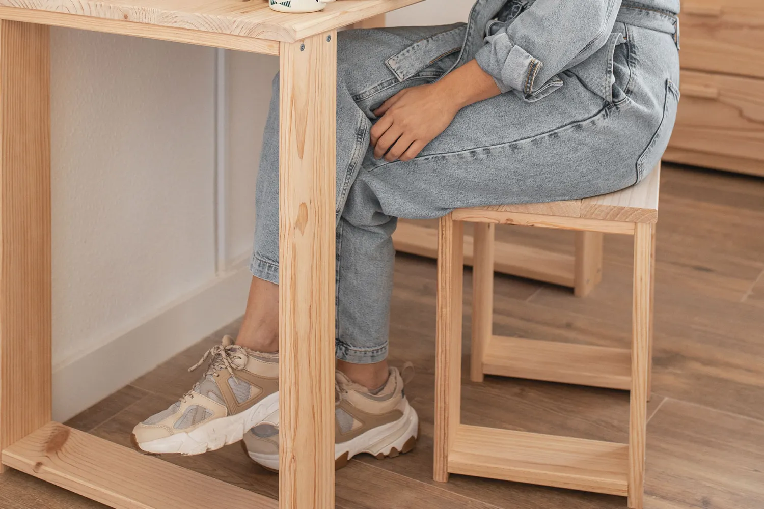 Taburete de madera de pino. Un práctico y decorativo taburete con función de asiento o como mesa de apoyo o mesita de noche. Compatible con todas las mesas de comedor de la serie BATU.