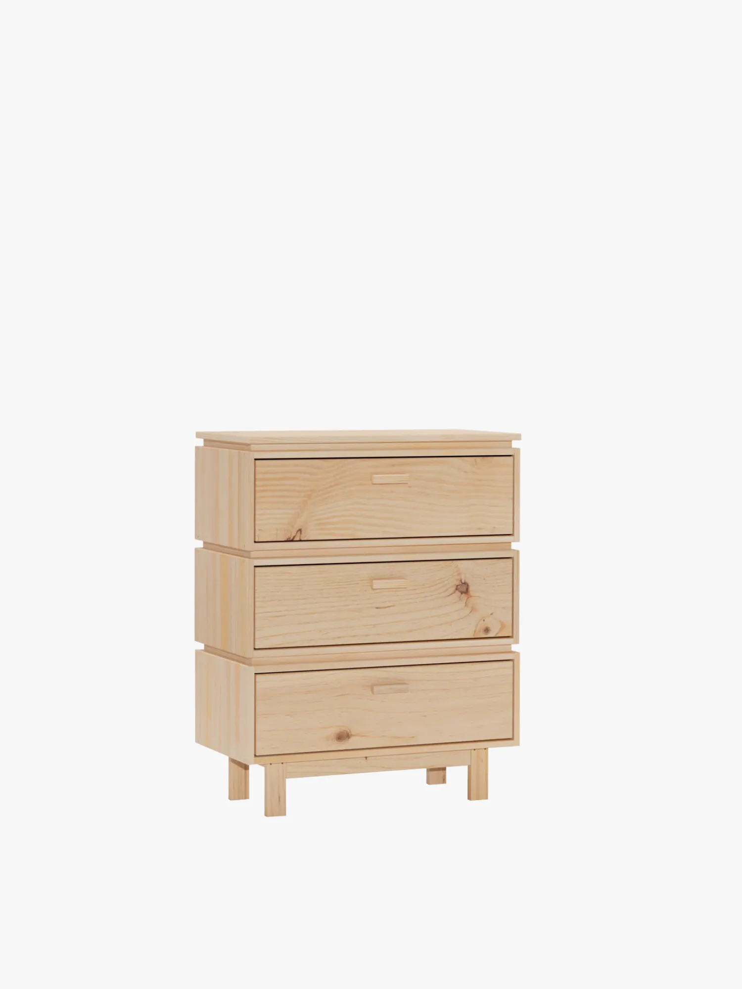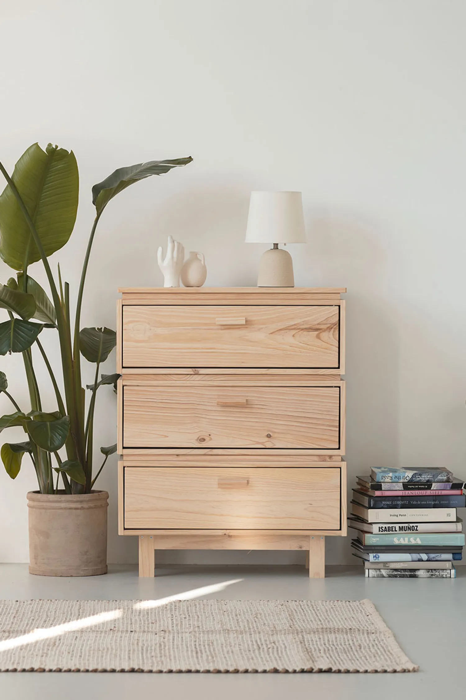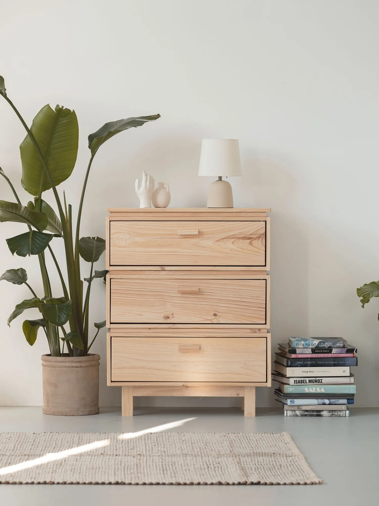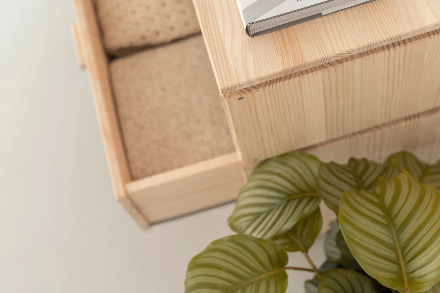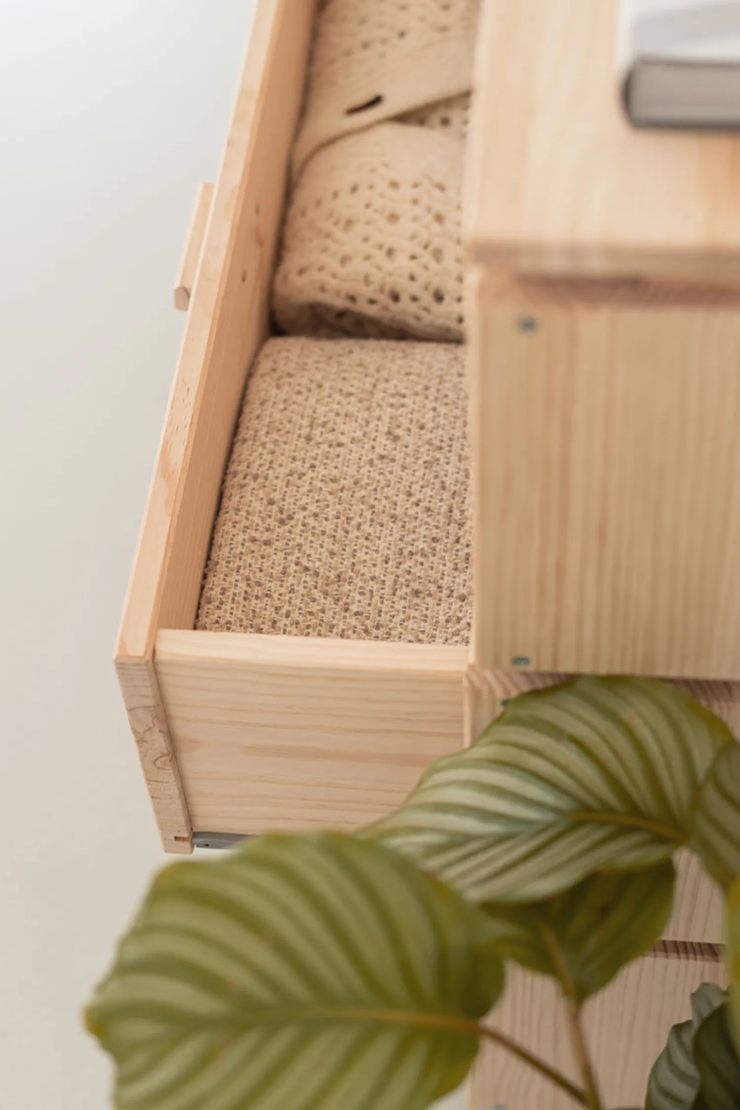 Este es un mueble sostenible y reciclable con certificación PEFC. Fabricado con madera maciza ecológica de pino insignis, procedente de bosques locales y sostenibles.