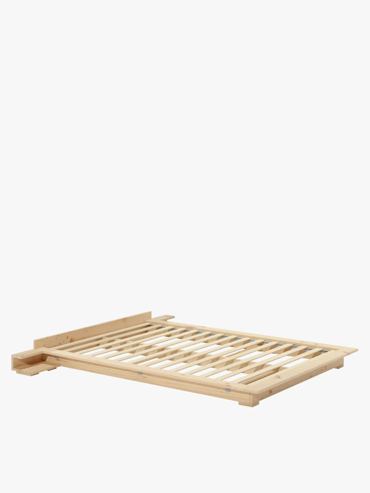 Cama japonesa de madera de pino maciza, con diseño bajo, depurado y dos mesitas a juego que se acoplan a la estructura. Una propuesta amplia y funcional para dormitorios compartidos que apuestan por el orden, la calma y los materiales naturales. Fabricada con madera local y certificada, al estilo auténtico de LUFE.