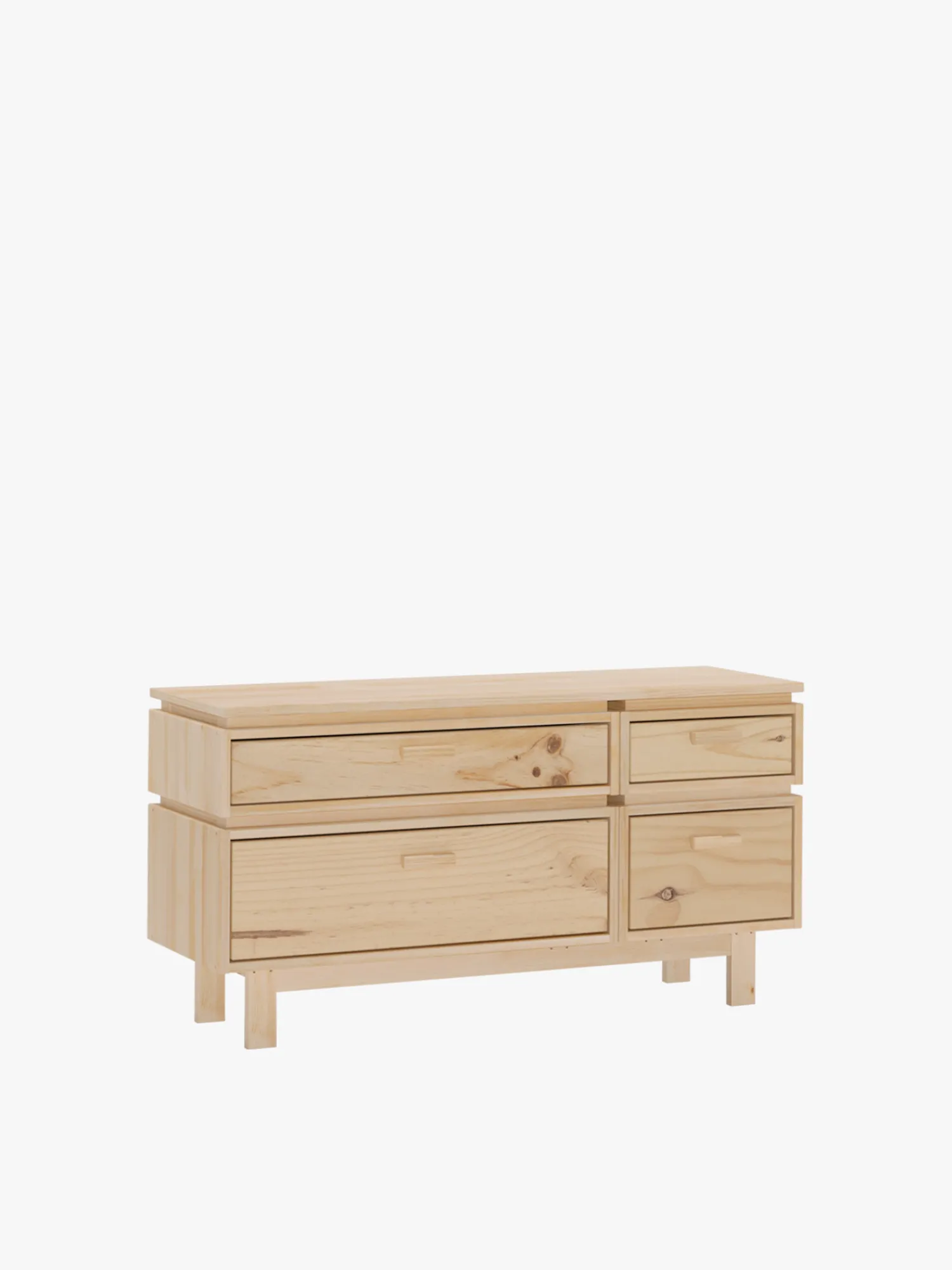 Cómoda doble de madera natural con patas y varios tamaños de cajón para tener cada objeto en su respectivo compartimento. Perfecto para salas de estar pequeñas, dormitorios o estudios.