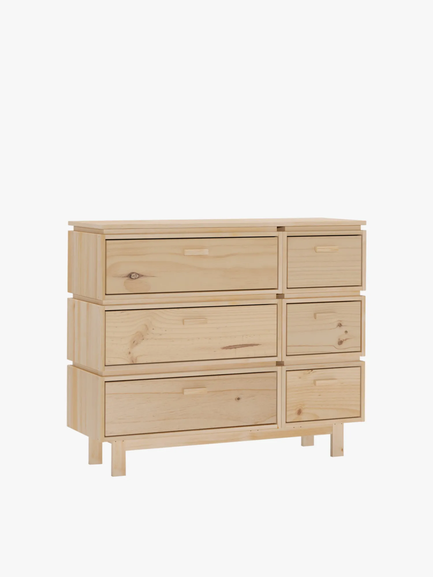 Amplia cómoda de madera natural de cuatro alturas con varios tamaños de cajón para tener cada objeto en su respectivo compartimento. Perfecto para dormitorios, salas de estar o recibidores.