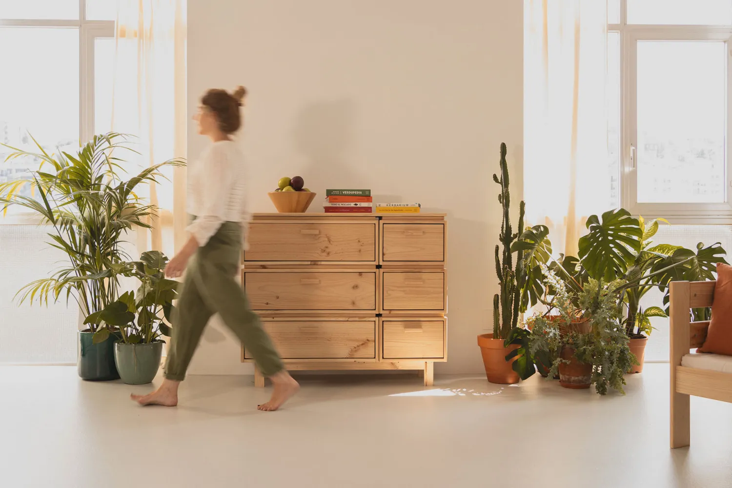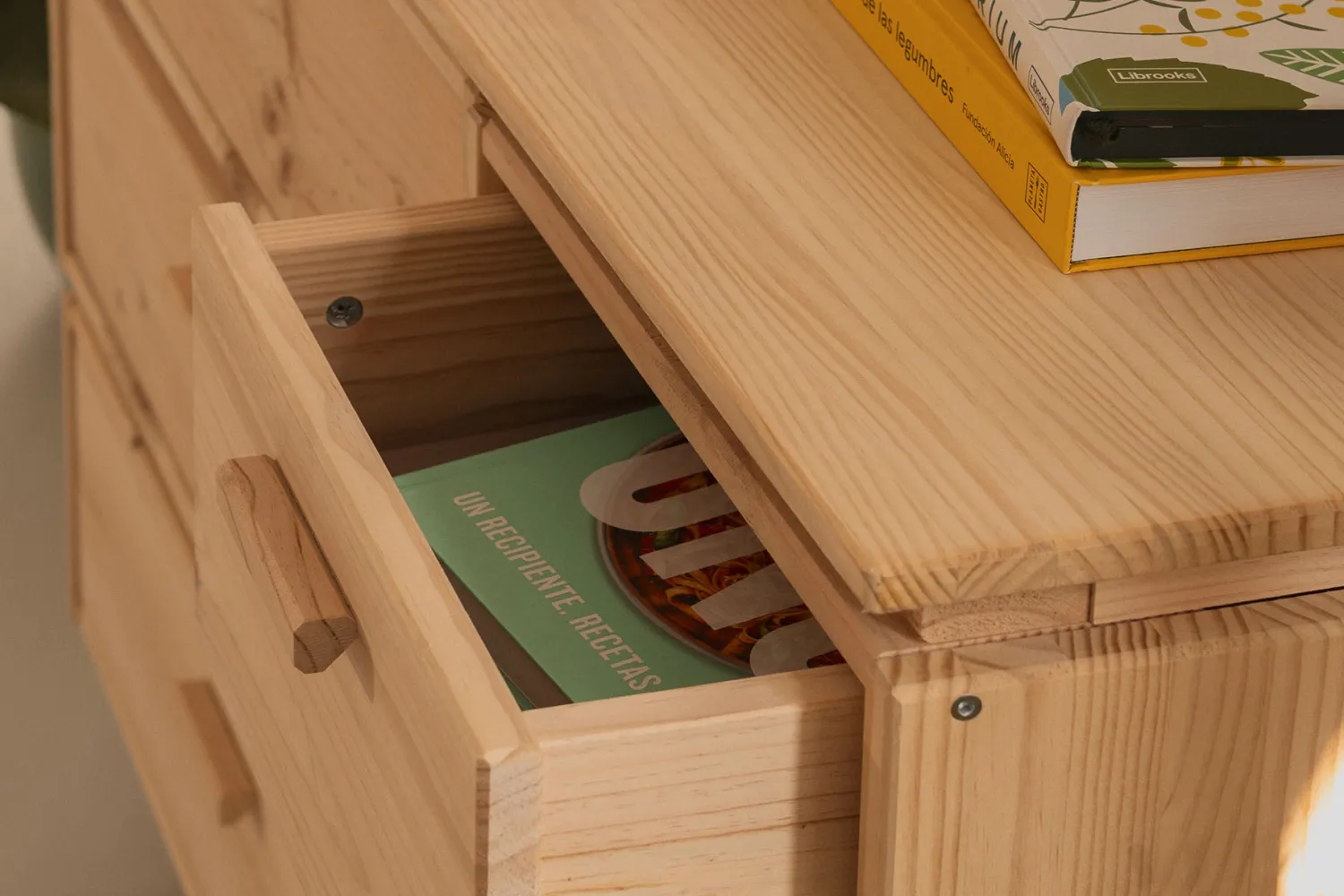 Madera natural, sin tintes ni barnices, lijada con máquina, lista para disfrutar al tacto y a la vista. Aunque como todas las maderas naturales, es un material con una superficie más delicada que las superficies sintéticas. Por eso conviene mimarla de vez en cuando.