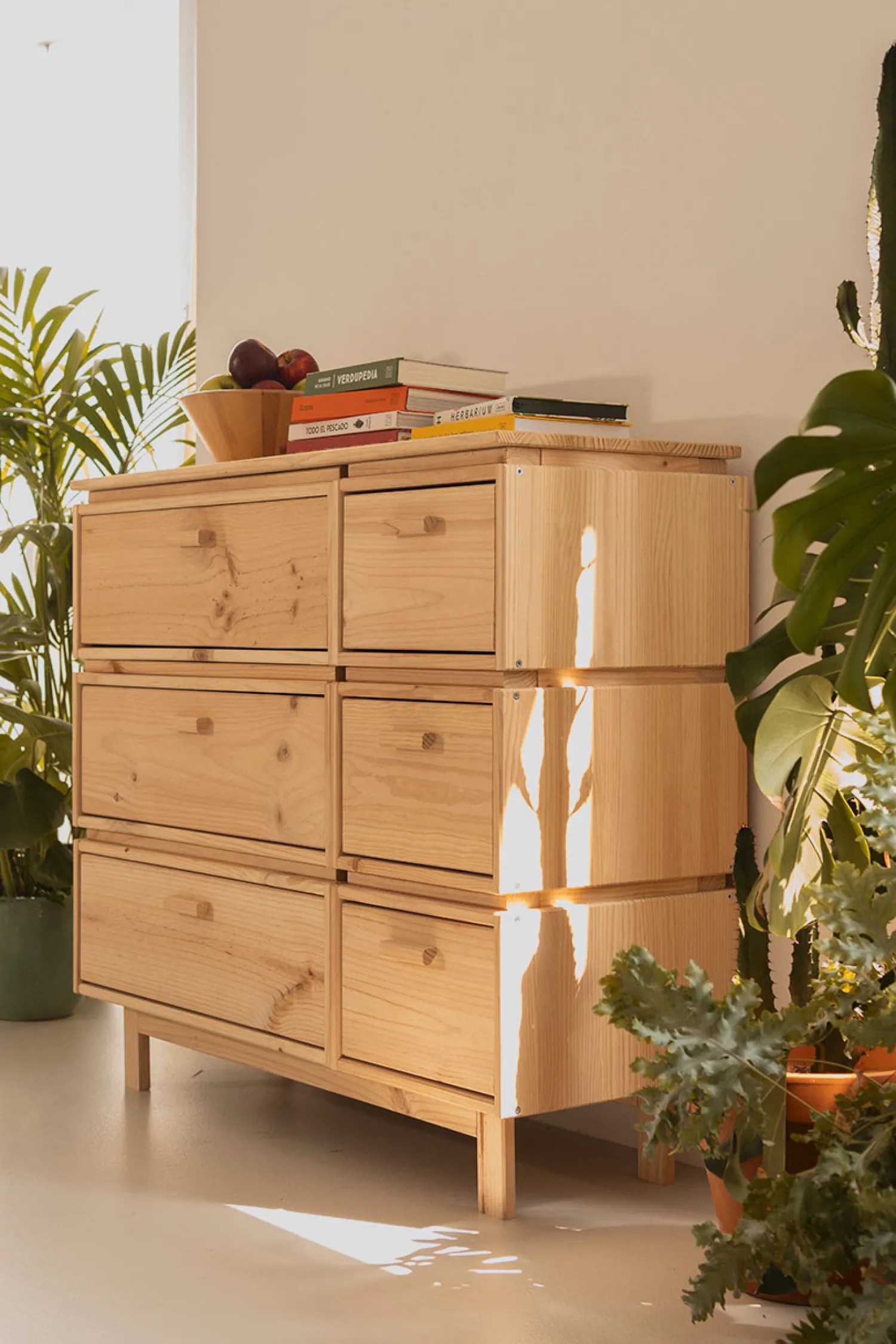 Este es un mueble sostenible y reciclable con certificación PEFC. Fabricado con madera maciza ecológica de pino insignis, procedente de bosques locales y sostenibles.