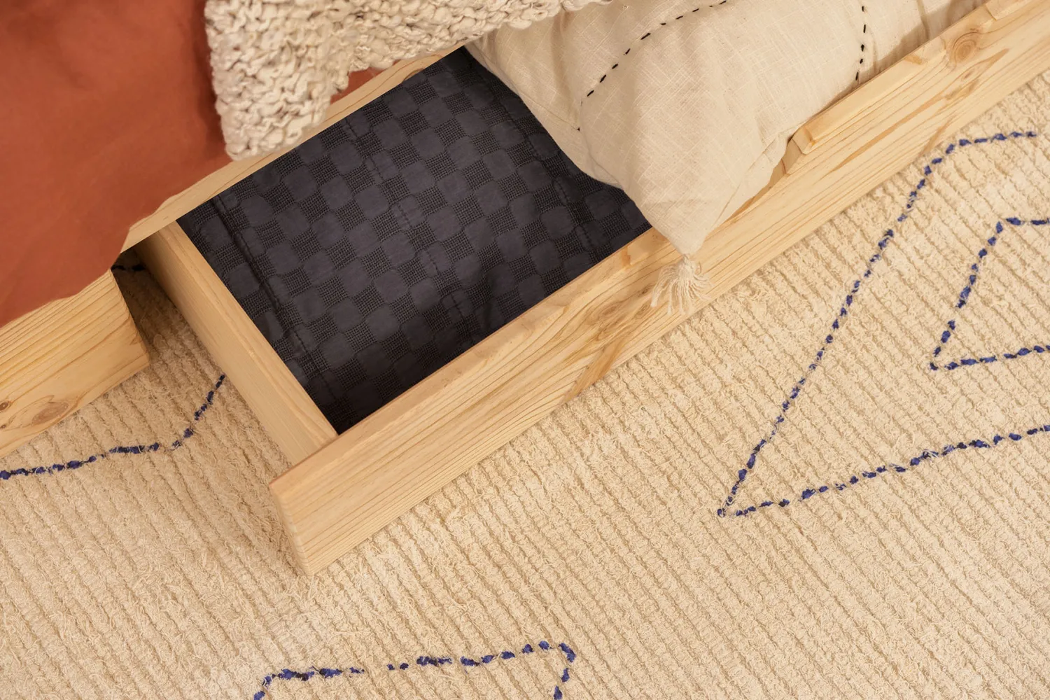Una práctica litera de madera natural que te ayuda a ganar espacio en tu dormitortio, por su tamaño reducido para colchones de 80 cm, y sus dos amplios cajones de almacenaje con ruedas integradas en la aparte inferior.