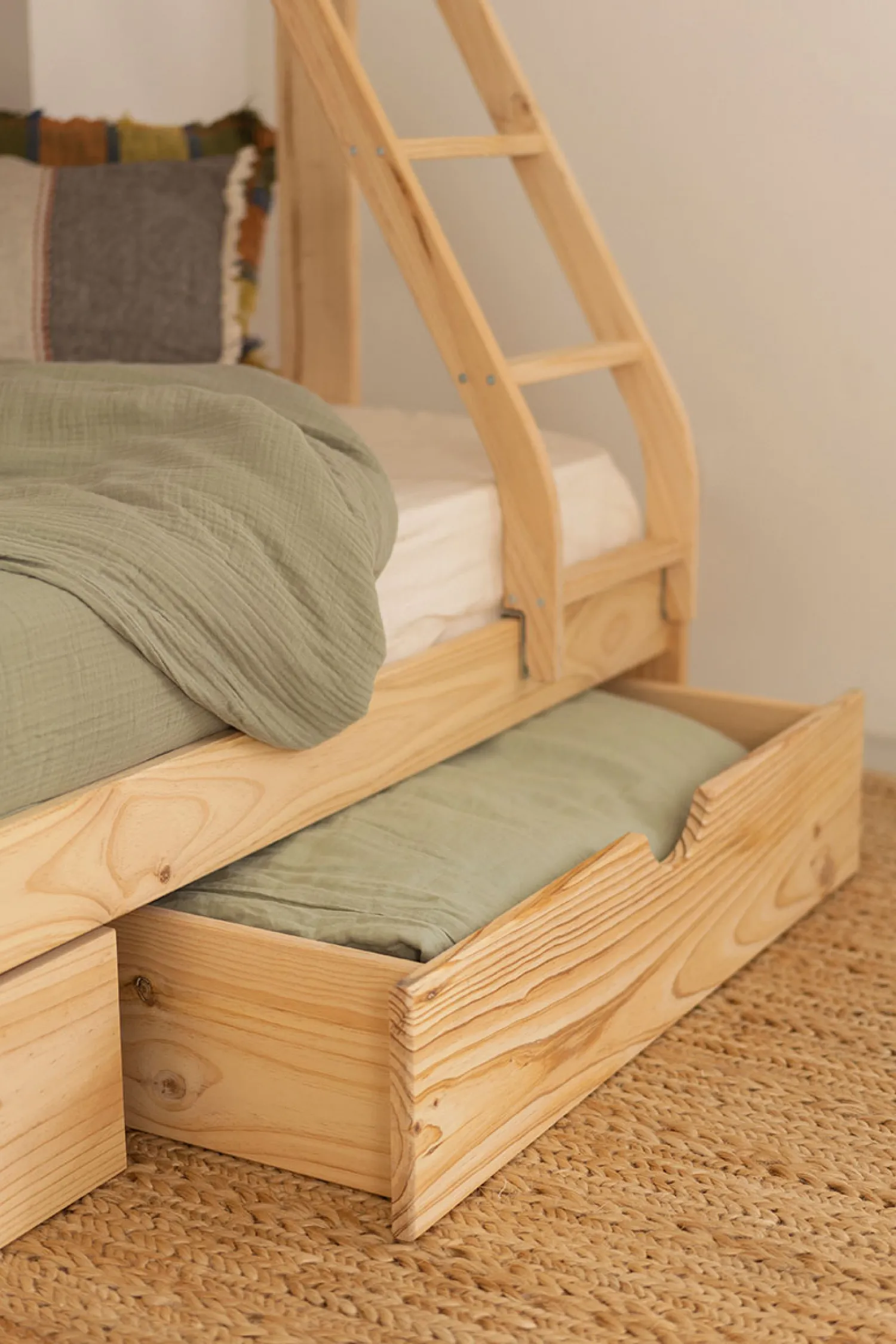 Litera triple con una cama individual y una cama doble de 140 cm. Una práctica litera de madera de ecológica con dos cajones de almacenaje con ruedas integradas para guardar ropa de cama o mantas. Incluye las lamas somier de ambas camas.