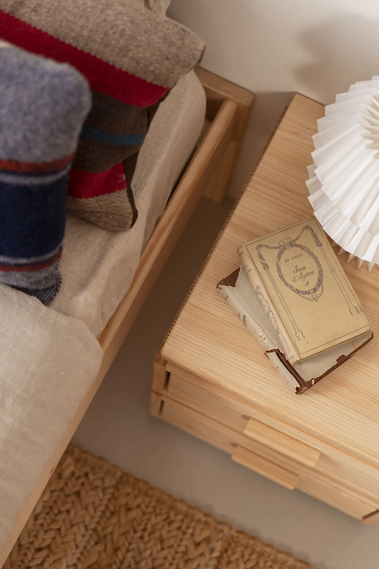 Mesita de noche con dos cajones pequeños fabricada en madera ecológica natural. Ideal para dormitorios infantiles o para habitaciones pequeñas.