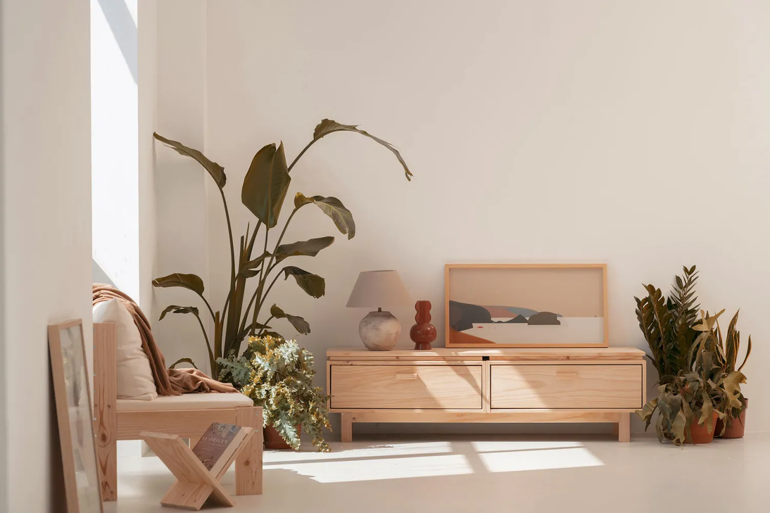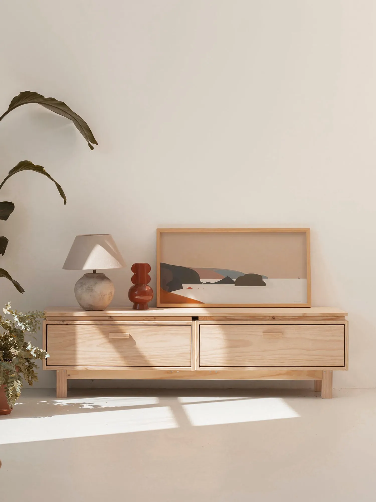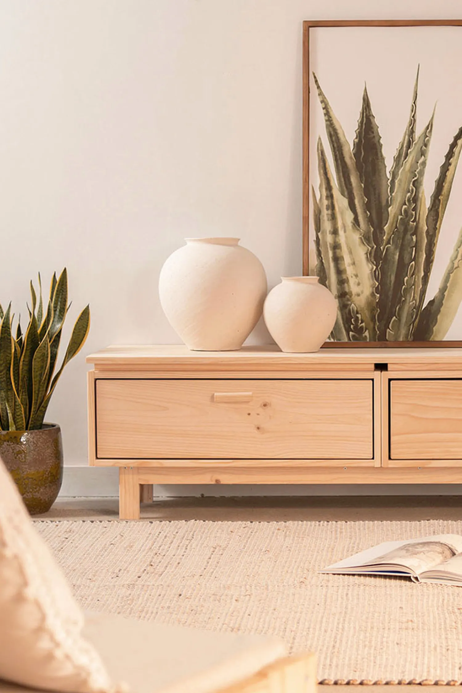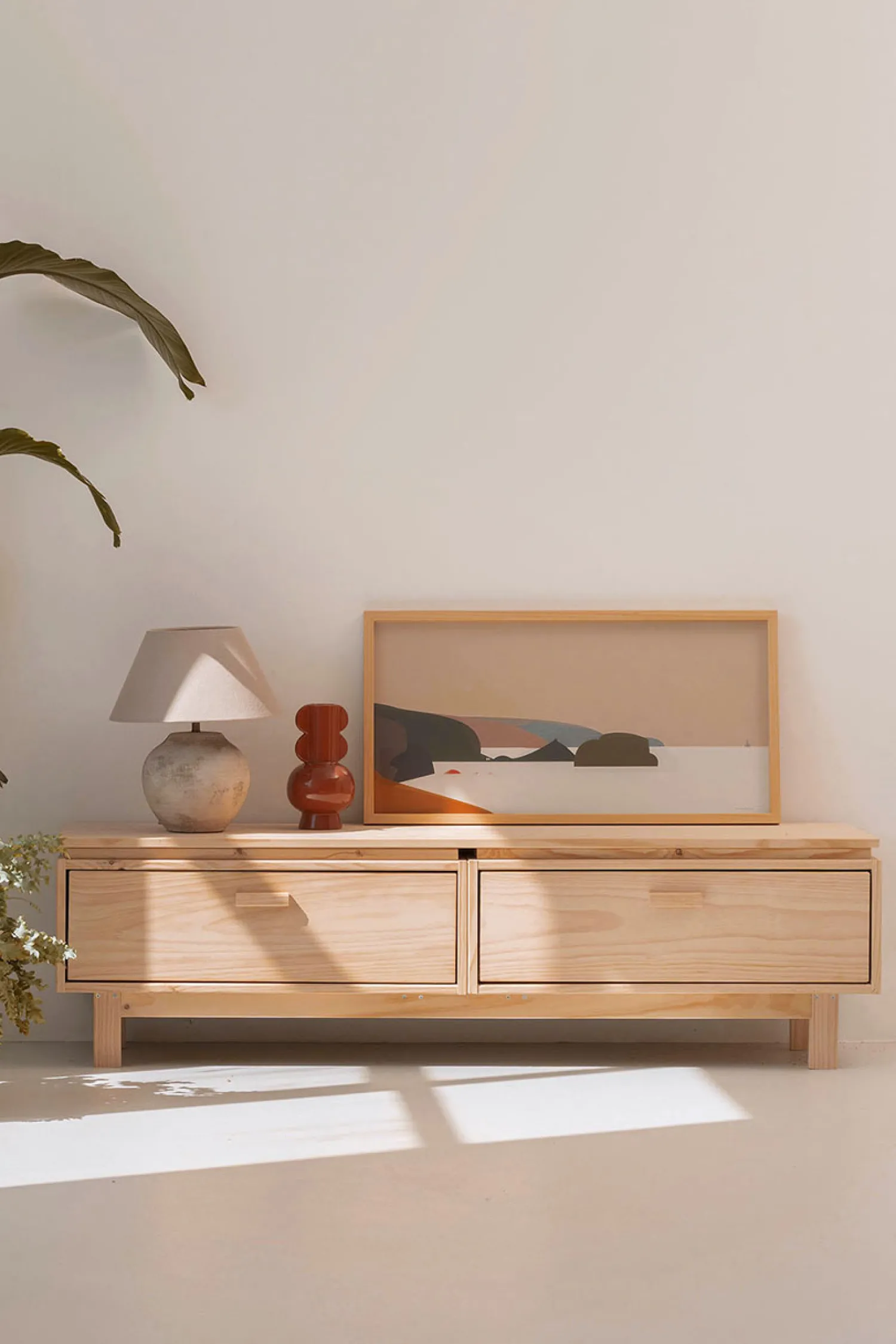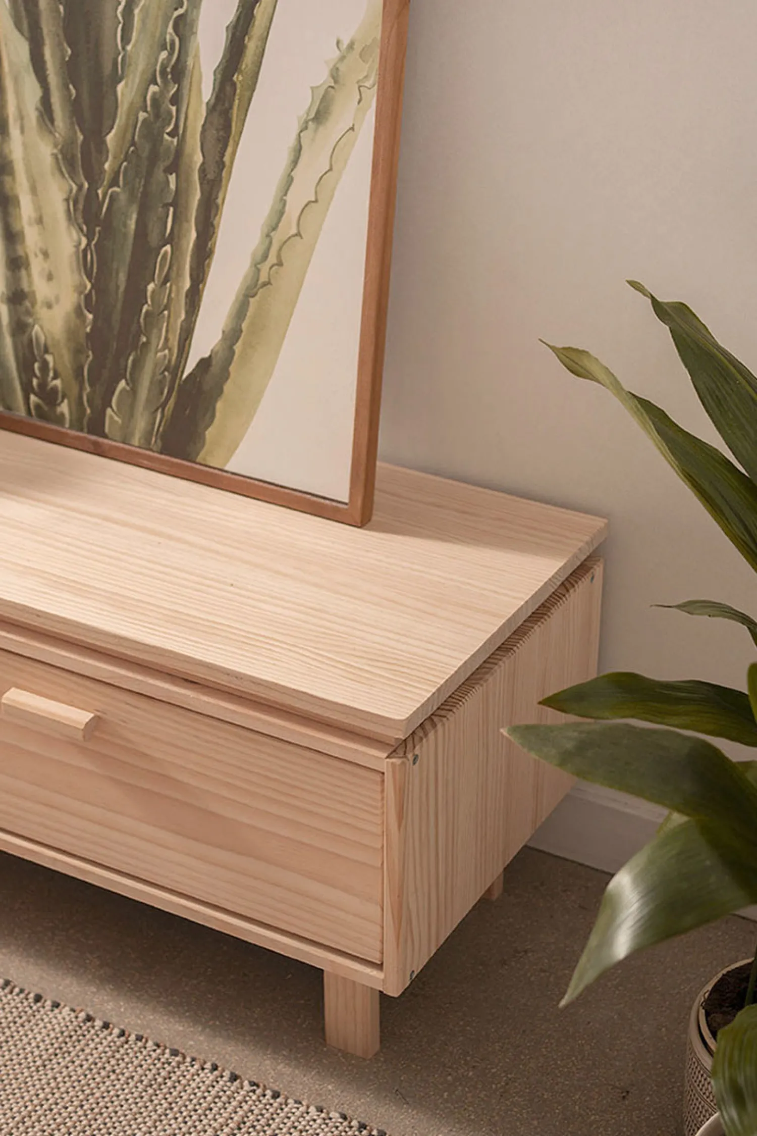 Mueble TV de madera natural con cajones, una pieza de mobiliario que combina la belleza natural de la madera con la funcionalidad del almacenaje. La madera de pino natural de este mueble TV aporta calidez y, en sus amplios cajones con rieles integrados puedes almacenar todo lo que imaginas.