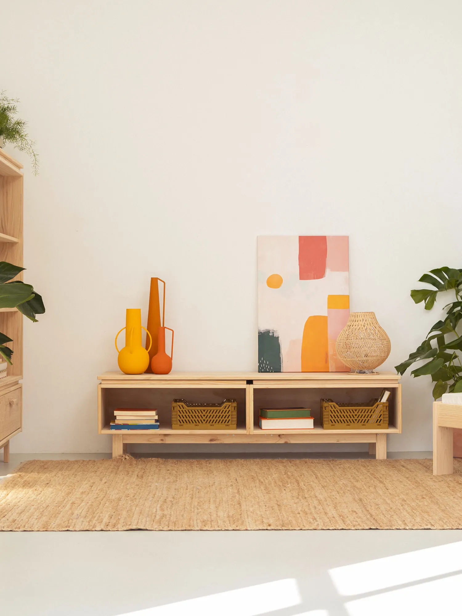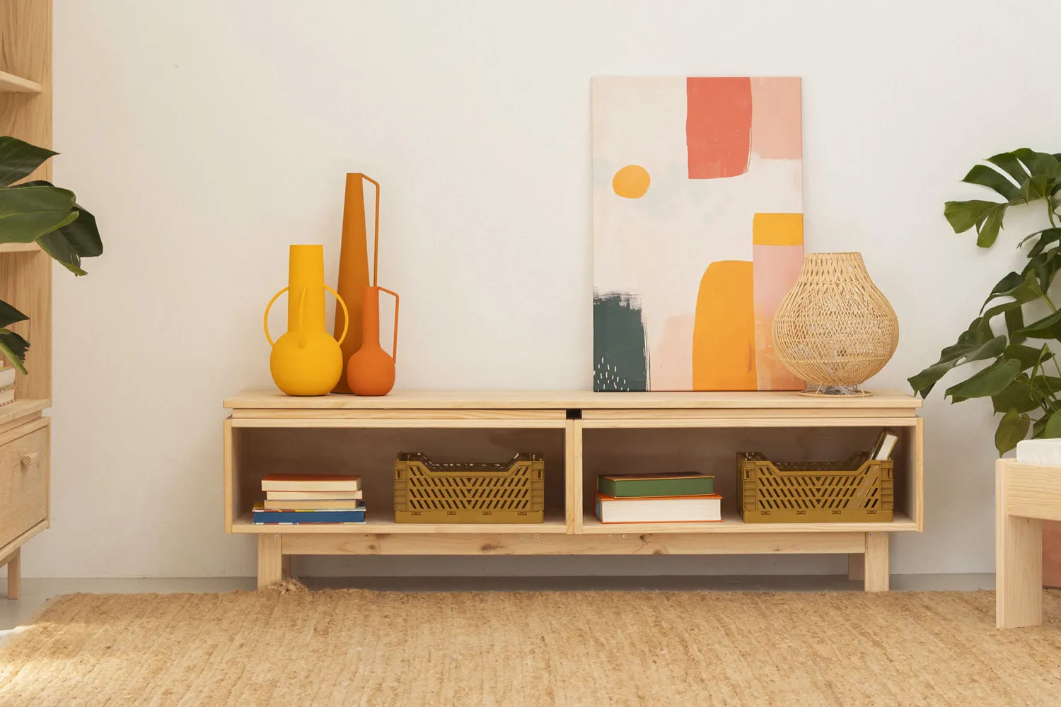 Mueble bajo de TV fabricado con madera ecológica y natural, con una amplia encimera y dos huecos de almacenaje para cajas o cestas. Este mueble combina funcionalidad y diseño para adaptarse a diferentes espacios de tu hogar. Fabricado con madera ecológica certificada, permite organizar y almacenar de forma eficiente, mientras mantiene un estilo fresco y atemporal.