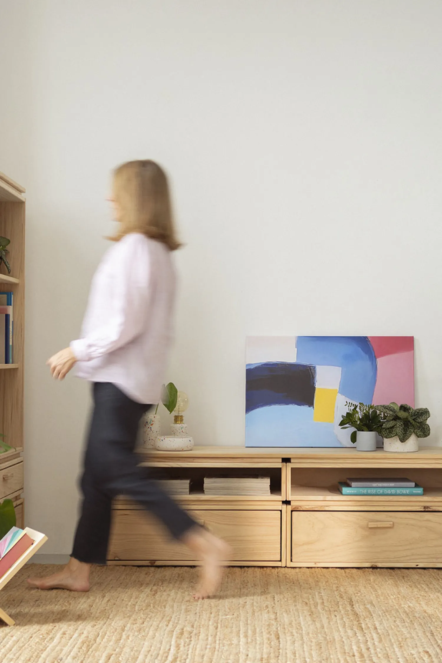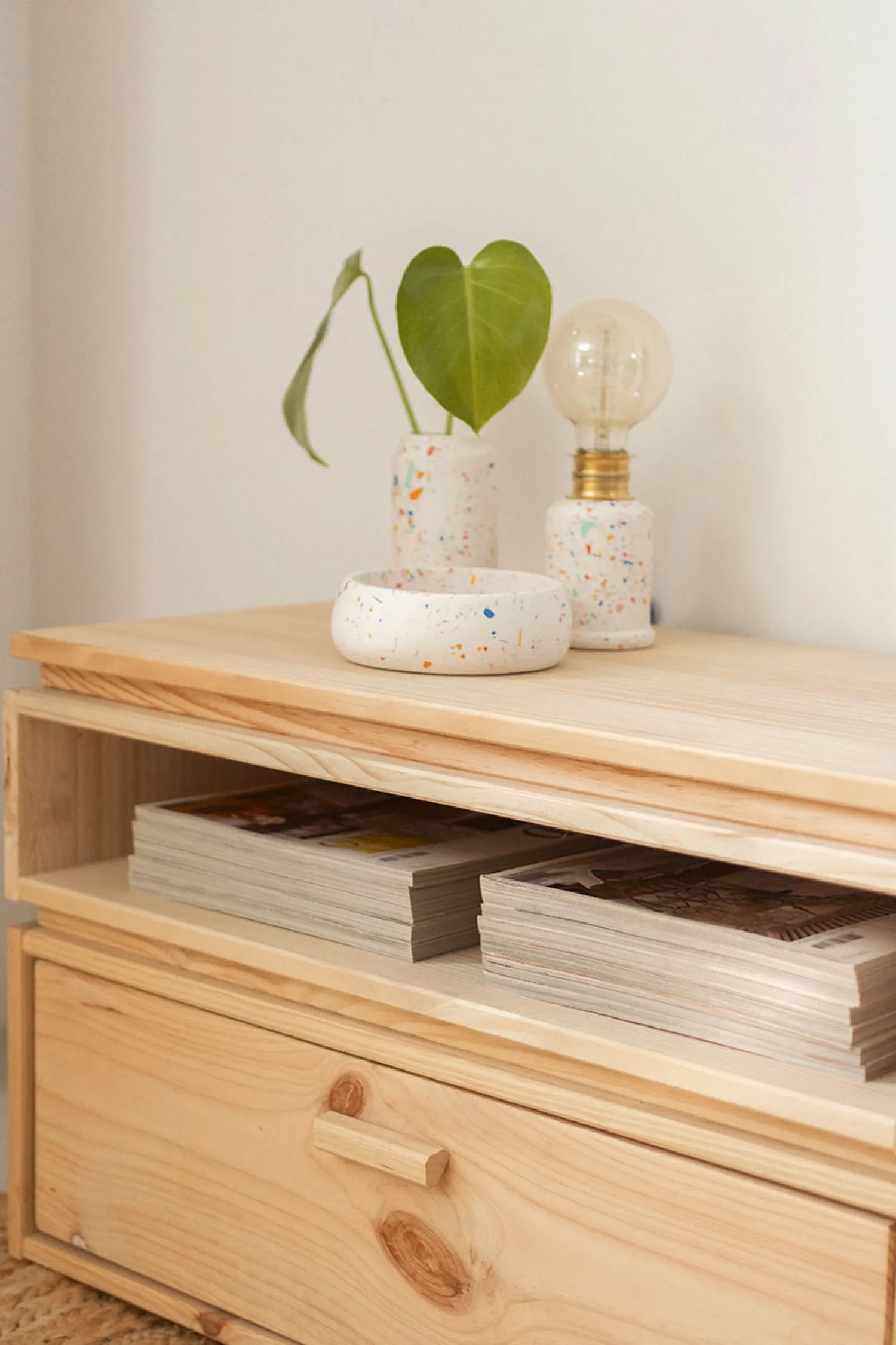 Mueble de diseño para TV fabricado con madera ecológica y natural, con una amplia encimera, dos huecos y dos grandes cajones de almacenaje. Este mueble combina funcionalidad y diseño, para adaptarse a diferentes espacios de tu hogar. Fabricado con madera ecológica natural, permite organizar y almacenar de forma eficiente, mientras mantiene un estilo nórdico y atemporal. Ideal para quienes buscan soluciones prácticas sin renunciar al diseño.