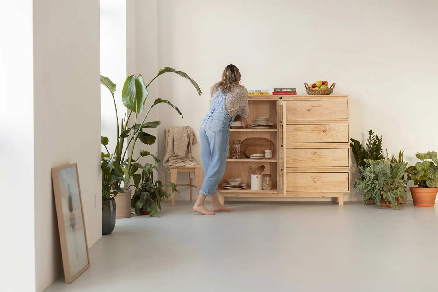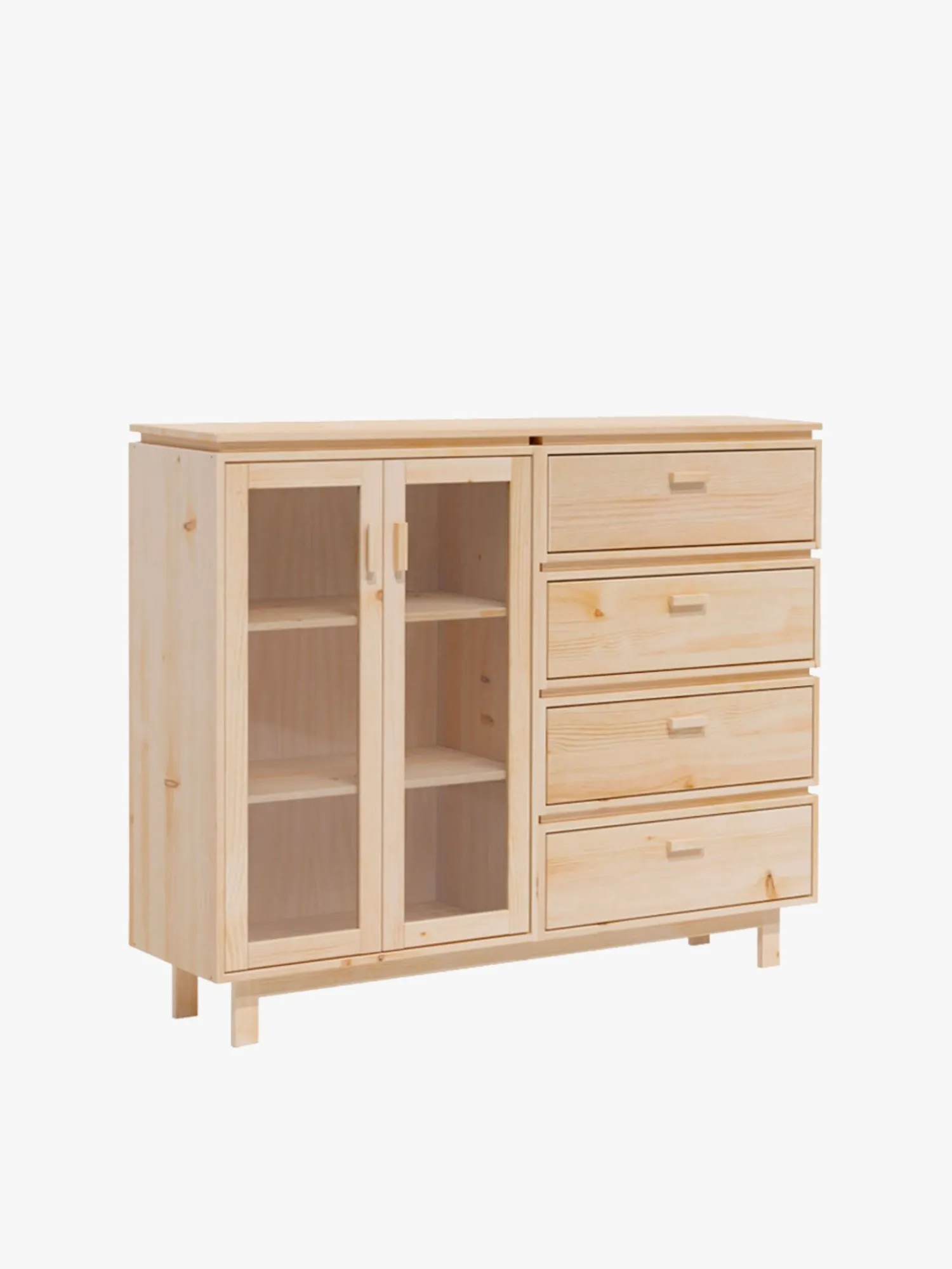 Vitrina de diseño con una cajonera integrada. Un mueble de almacenaje de madera maciza y natural, muy práctico para comedores, salones o cocinas.