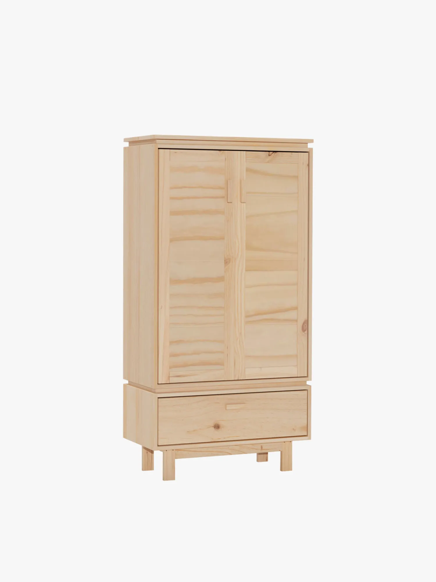 Armario bajo de madera de pino maciza y natural, con un cajón inferior que añade funcionalidad y patas que aportan ligereza visual. Su estética nórdica y líneas depuradas lo convierten en una pieza esencial para mantener el orden en cualquier estancia: ropa, menaje, mantas… ¡lo que necesites! Fabricado con madera local y certificada, combina la calidez de la madera natural con la autenticidad y el diseño de LUFE.