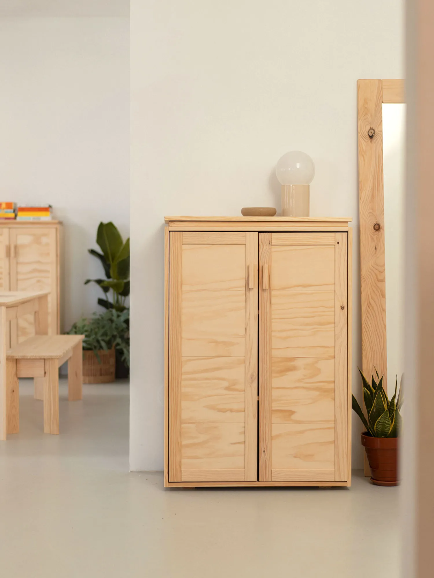 Armario aparador de madera de pino maciza y natural, con tres baldas interiores que ofrecen un amplio espacio de almacenaje. Su diseño atemporal y de estilo nórdico lo convierte en una pieza versátil para mantener el orden y la armonía en cualquier estancia. Una opción funcional y elegante, fabricada con madera local de calidad y con el inconfundible estilo LUFE.