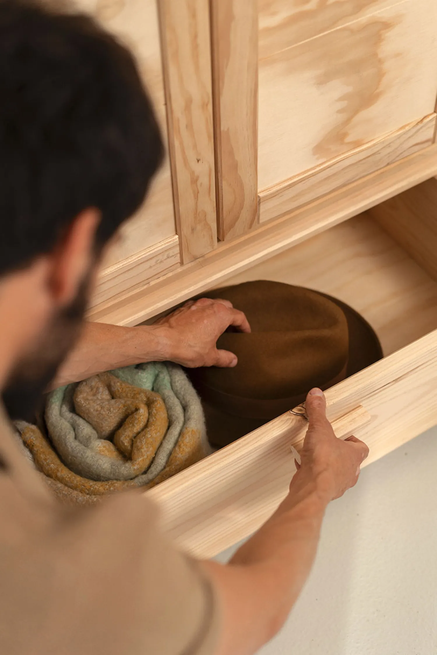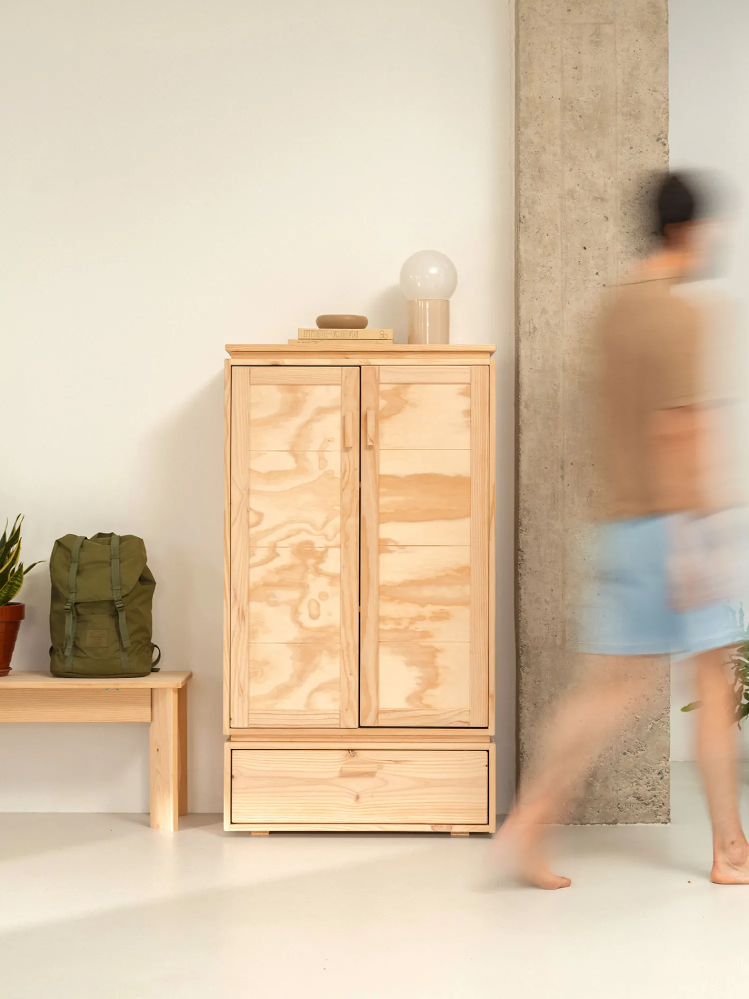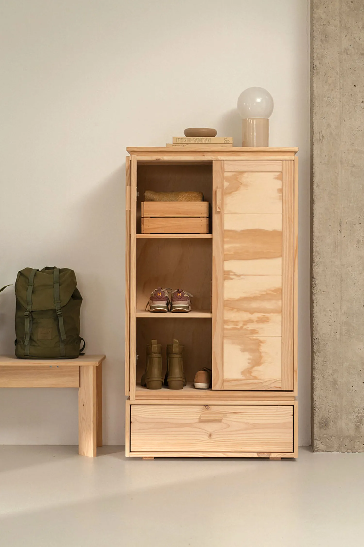 Armario bajo de madera de pino maciza y natural, con un cajón inferior que añade funcionalidad al diseño. Su estética nórdica, con líneas rectas y limpias, lo convierte en una pieza versátil para mantener el orden en cualquier estancia. Fabricado con madera local y certificada, refleja la calidez y autenticidad que caracterizan a LUFE.