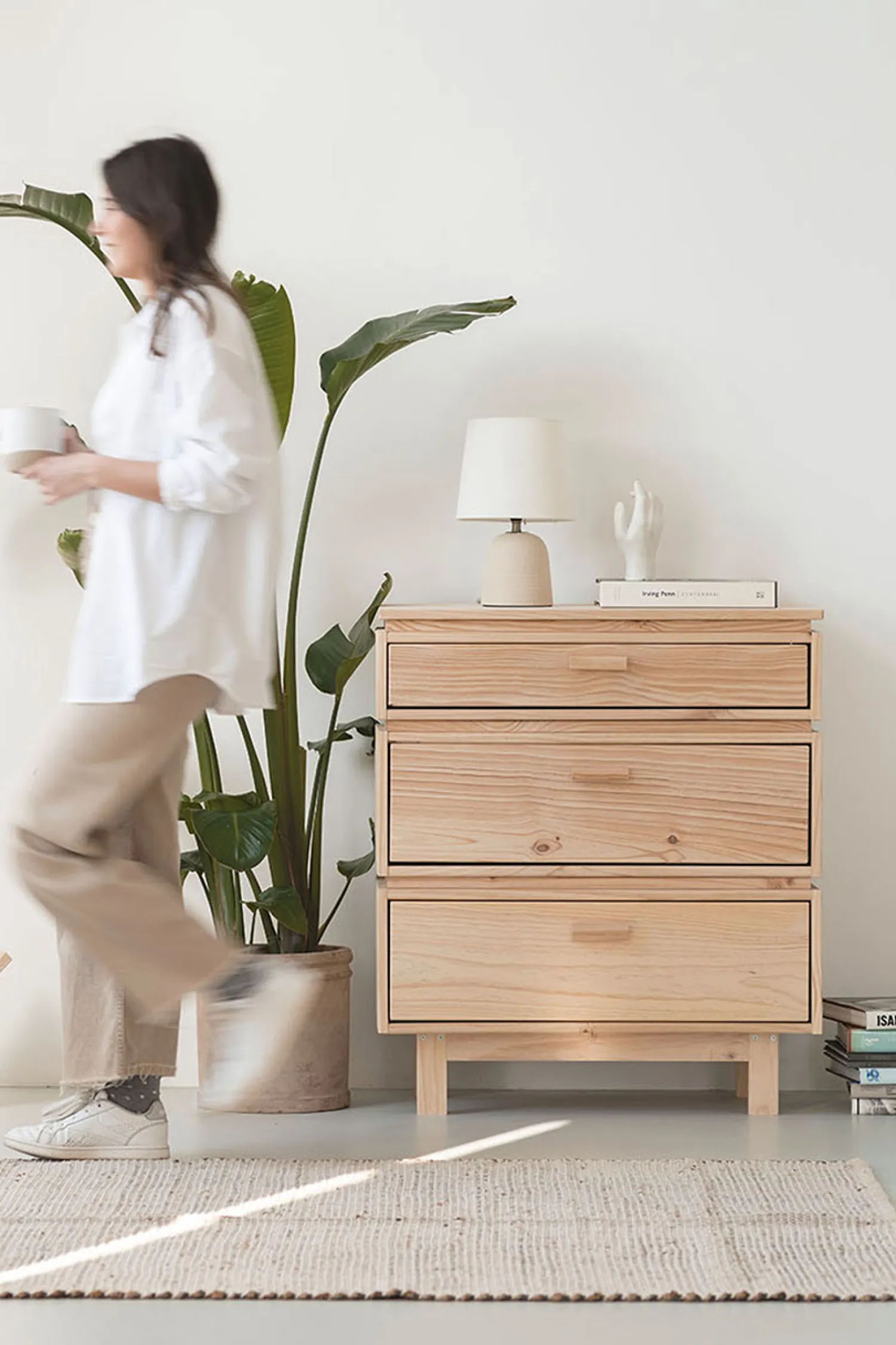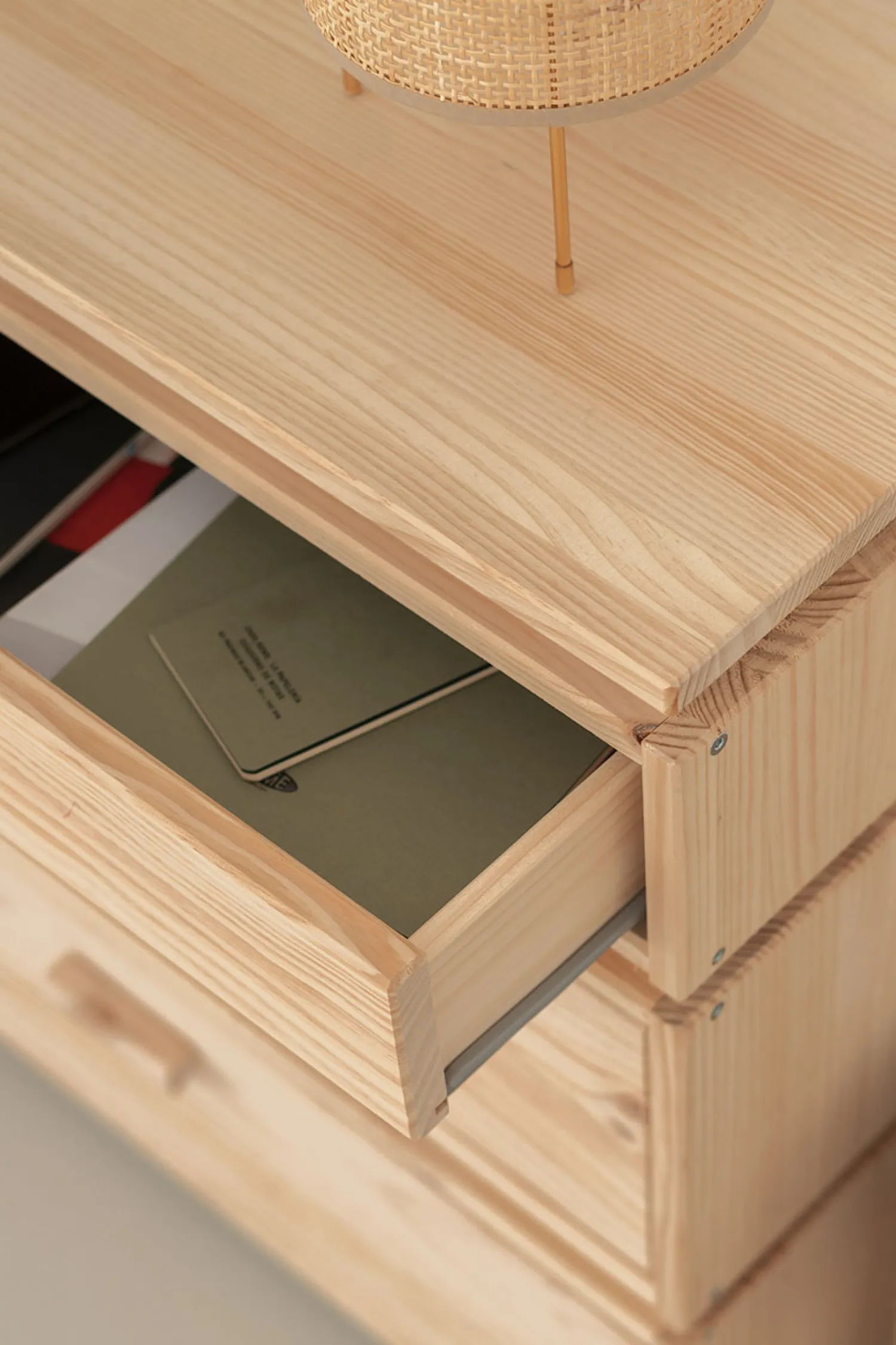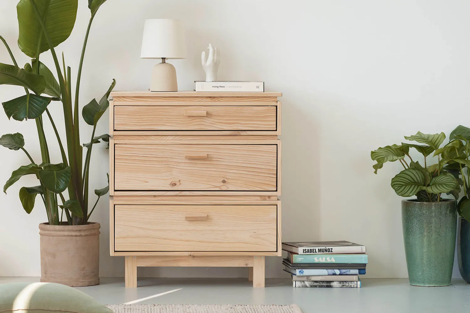 Práctica cajonera modular fabricada con madera de pino natural. Incluye tres amplios cajones de almacenaje con rieles integrados para una apertura suave.