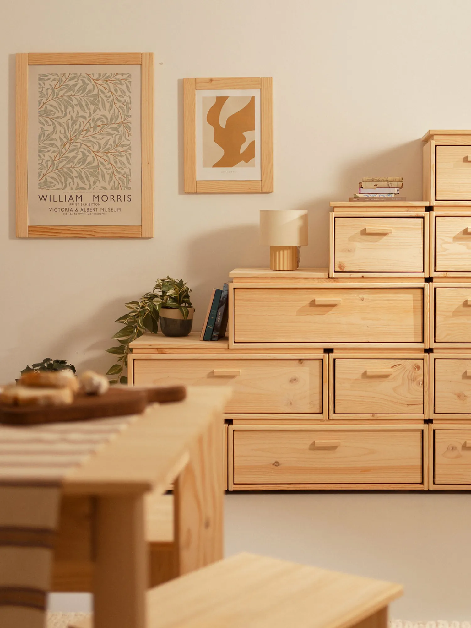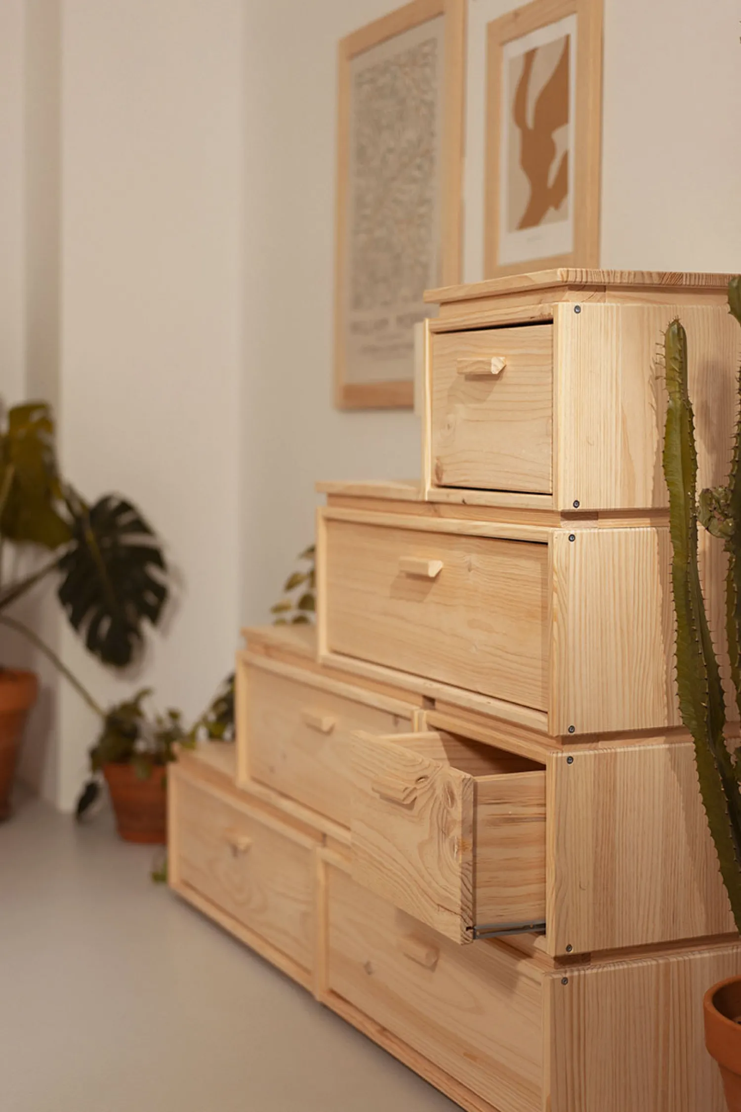 Este es un mueble sostenible y reciclable con certificación PEFC. Fabricado con madera maciza ecológica de pino insignis, procedente de bosques locales y sostenibles.