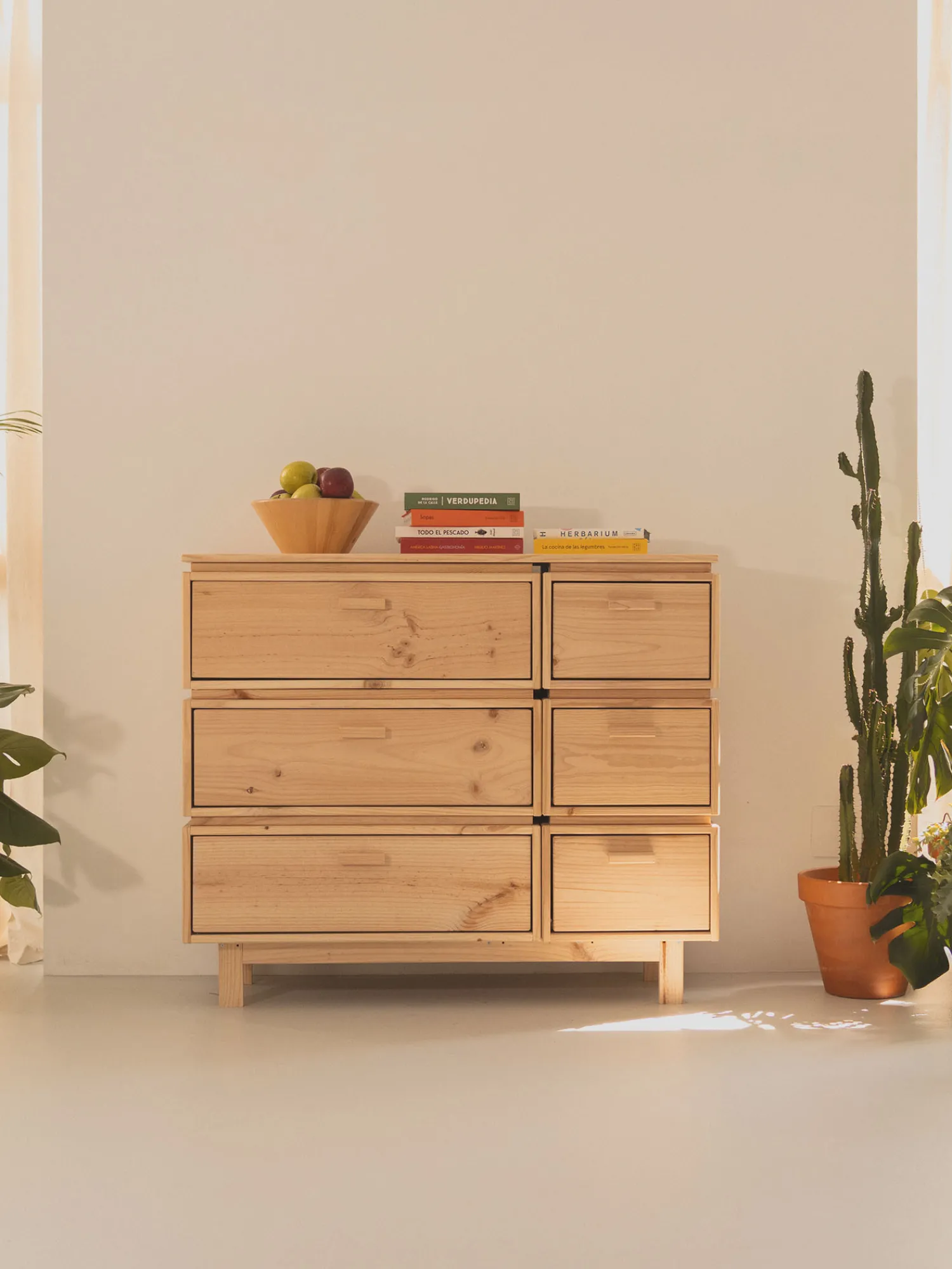 Amplia cómoda de madera natural de cuatro alturas con varios tamaños de cajón para tener cada objeto en su respectivo compartimento. Perfecto para dormitorios, salas de estar o recibidores.