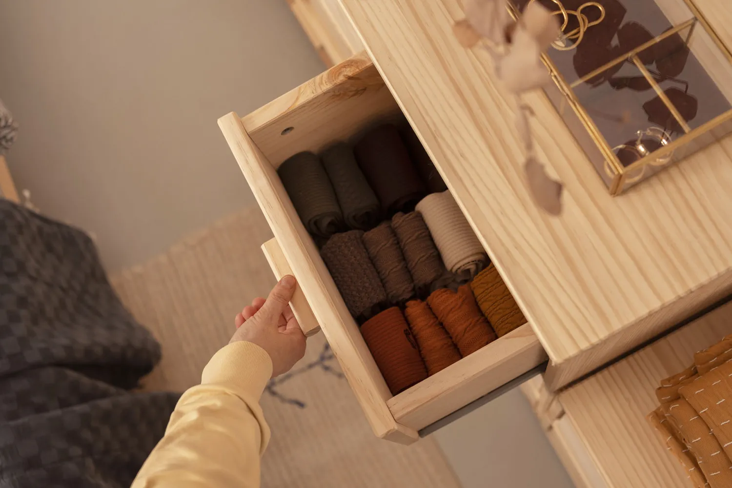 Cómoda de madera maciza de tres alturas con 6 cajones que llevan rieles incluidos. Perfecta para almacenar ropa de cama o accesorios en el dormitorio.