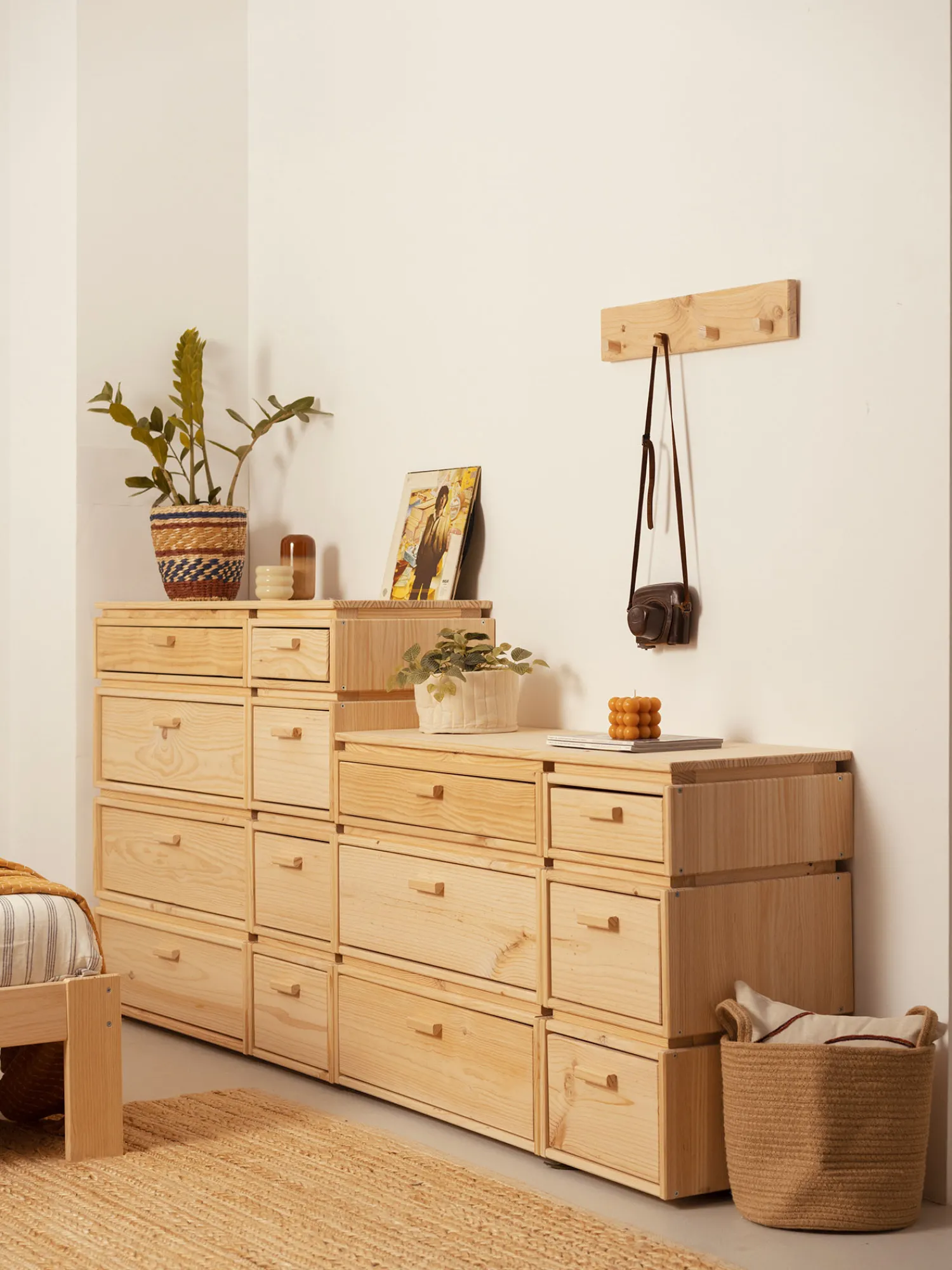 Amplia cómoda doble de madera natural de 5 alturas con varios tamaños de cajón para tener cada objeto en su respectivo compartimento. Perfecta para dormitorios dobles, recibidores o salas de estar.