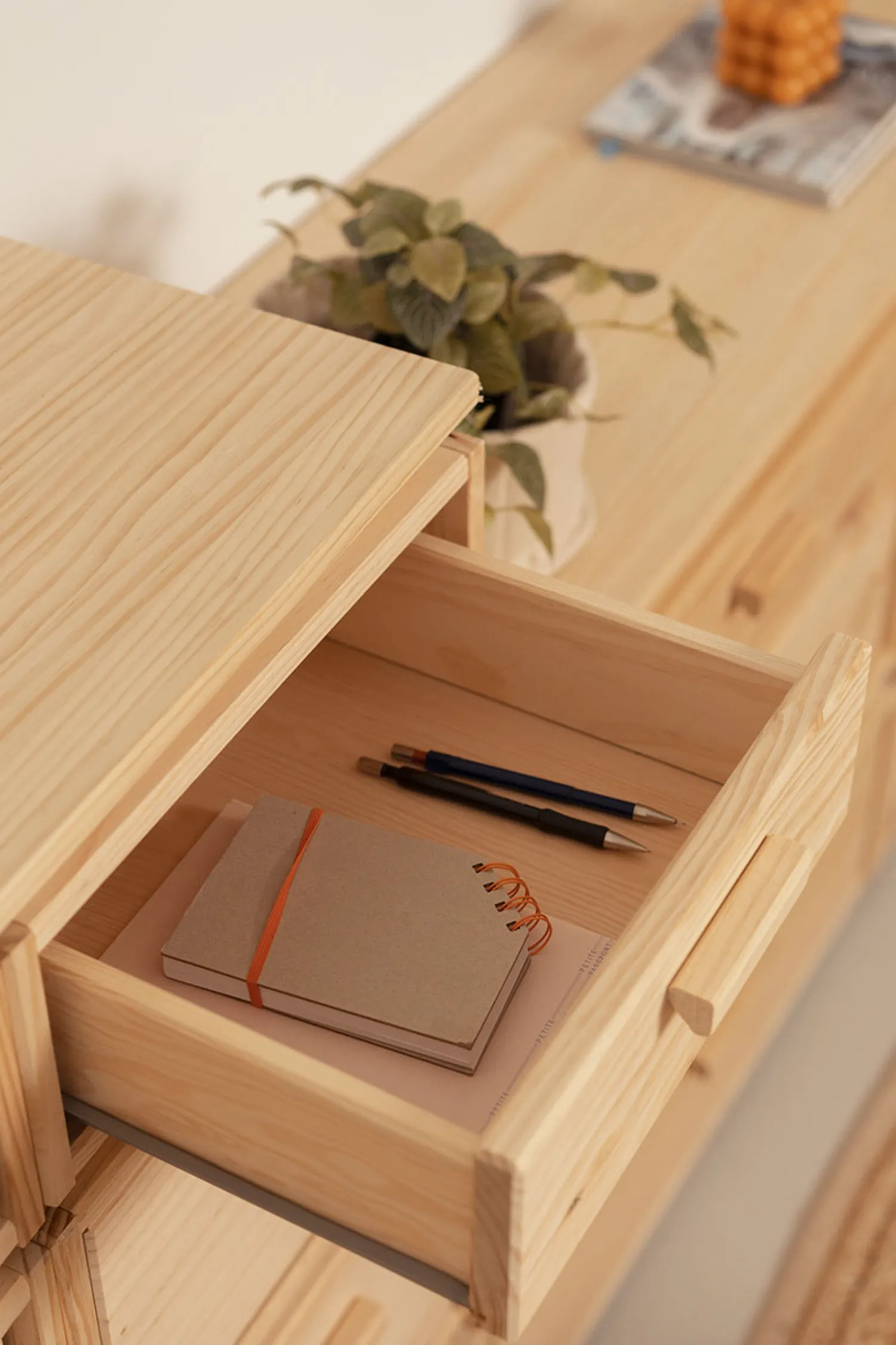 Este es un mueble sostenible y reciclable con certificación PEFC. Fabricado con madera maciza ecológica de pino insignis, procedente de bosques locales y sostenibles.