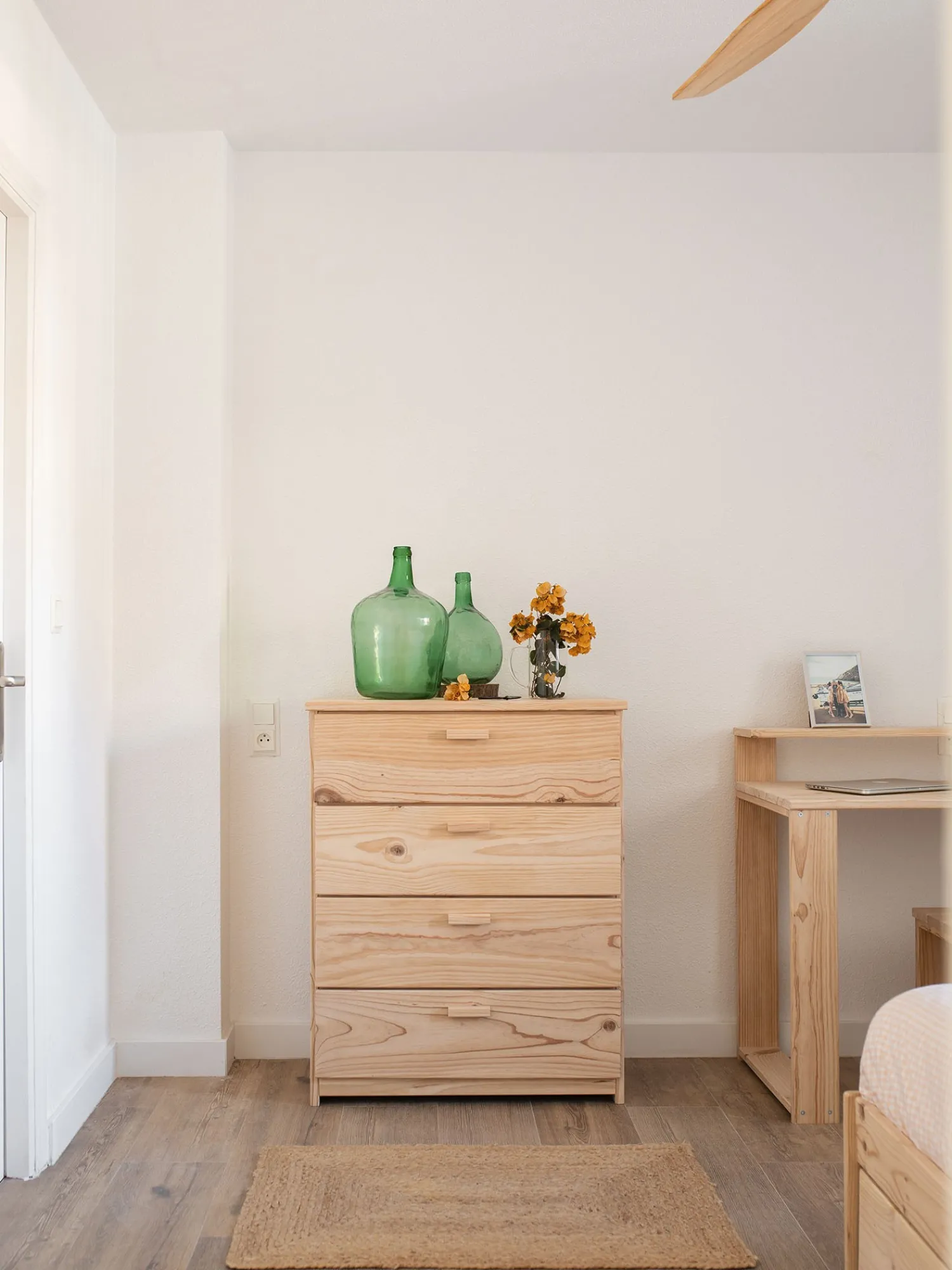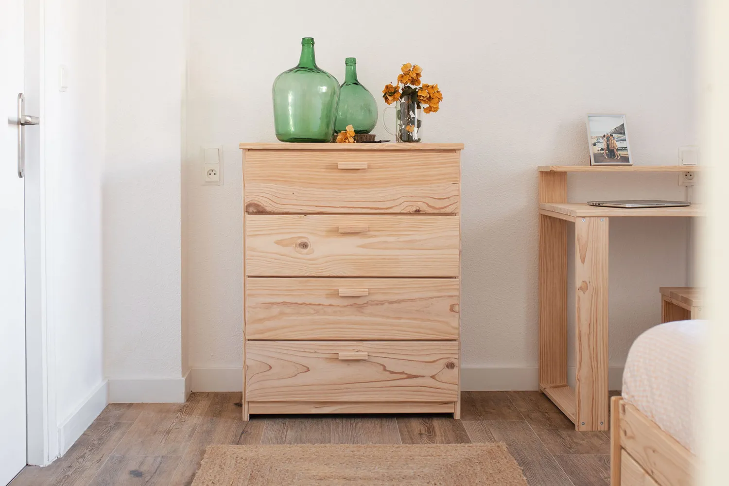 Madera natural, sin tintes ni barnices, lijada con máquina, lista para disfrutar al tacto y a la vista. Aunque como todas las maderas naturales, es un material con una superficie más delicada que las superficies sintéticas. Por eso conviene mimarla de vez en cuando.