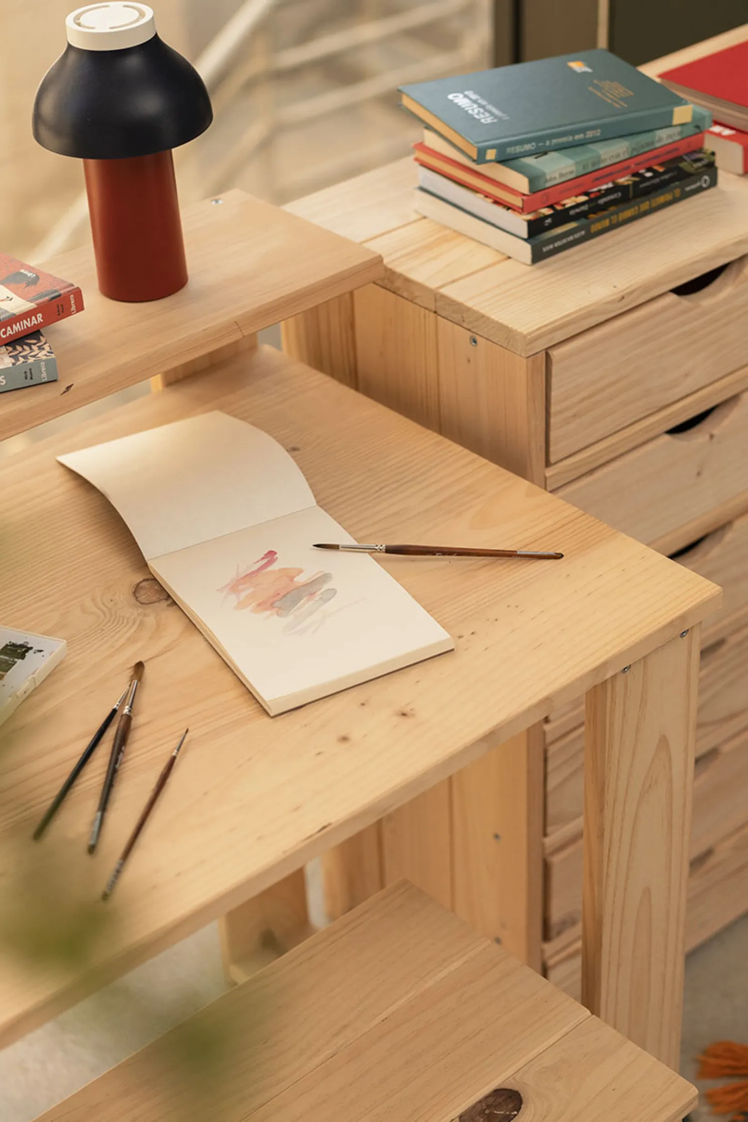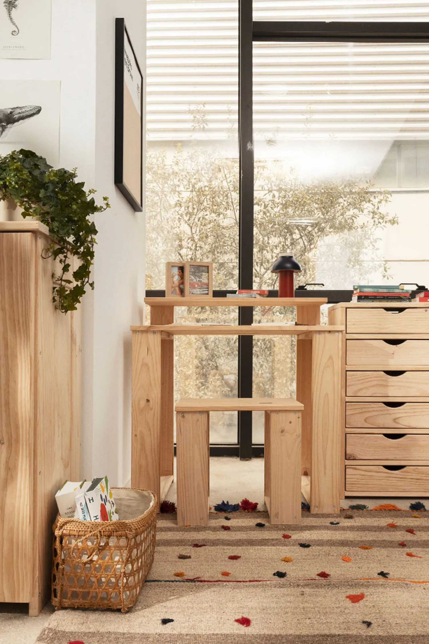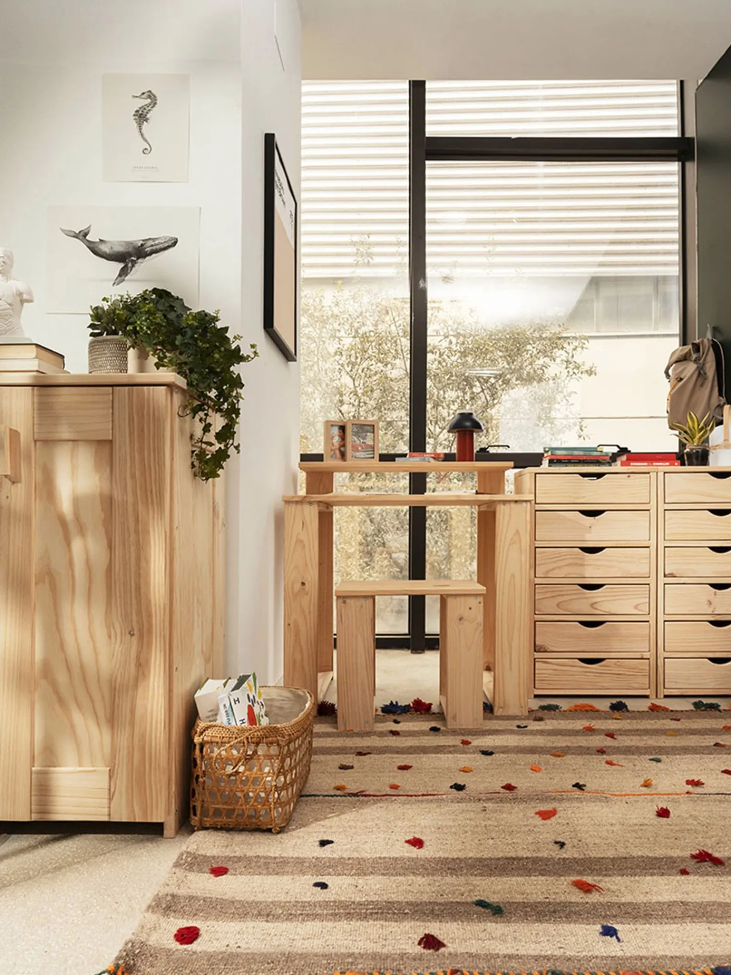 Este es un mueble sostenible y reciclable con certificación PEFC. Fabricado con madera maciza ecológica de pino insignis, procedente de bosques locales y sostenibles.