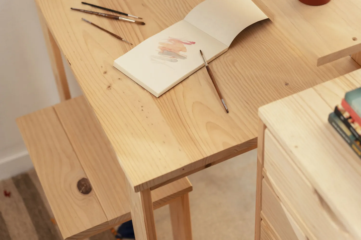 Madera natural, sin tintes ni barnices, lijada con máquina, lista para disfrutar al tacto y a la vista. Aunque como todas las maderas naturales, es un material con una superficie más delicada que las superficies sintéticas. Por eso conviene mimarla de vez en cuando.