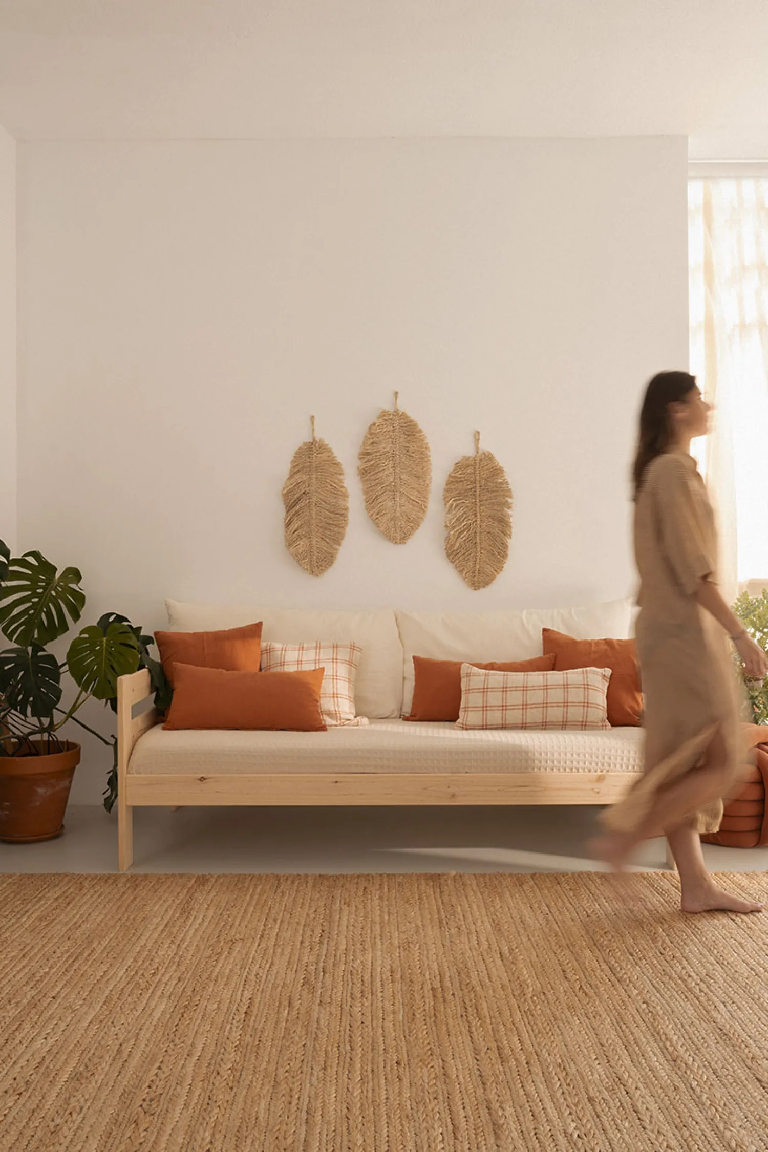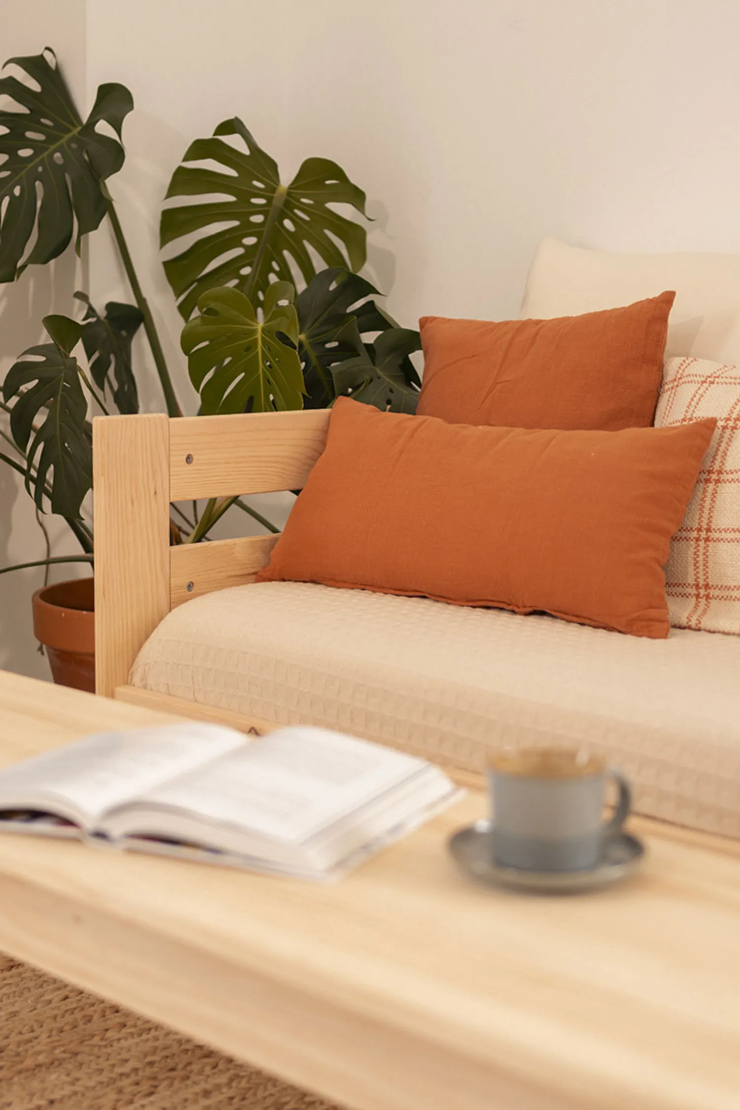 Diván individual de madera maciza con colchón y respaldo incluido. Una cama diván para colchón de 90 cm que sirve de cama por la noche y de sofá para la sala de estar o la habitación de invitados.