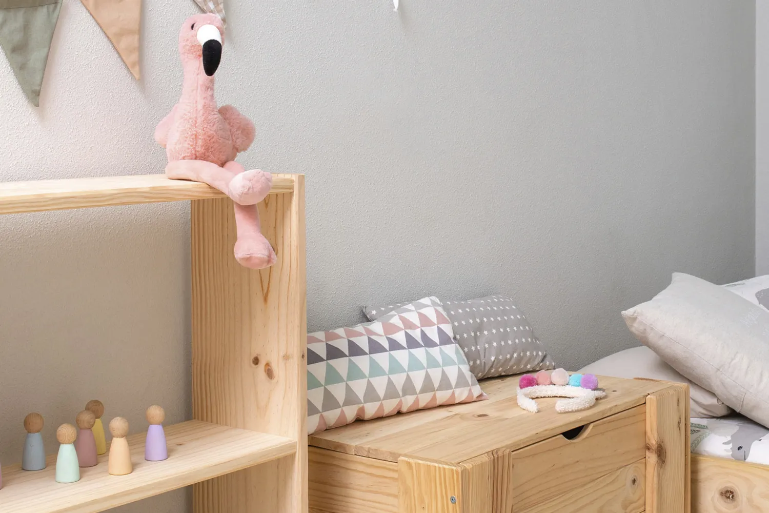 Este es un mueble sostenible y reciclable con certificación PEFC. Fabricado con madera maciza ecológica de pino insignis, procedente de bosques locales y sostenibles.