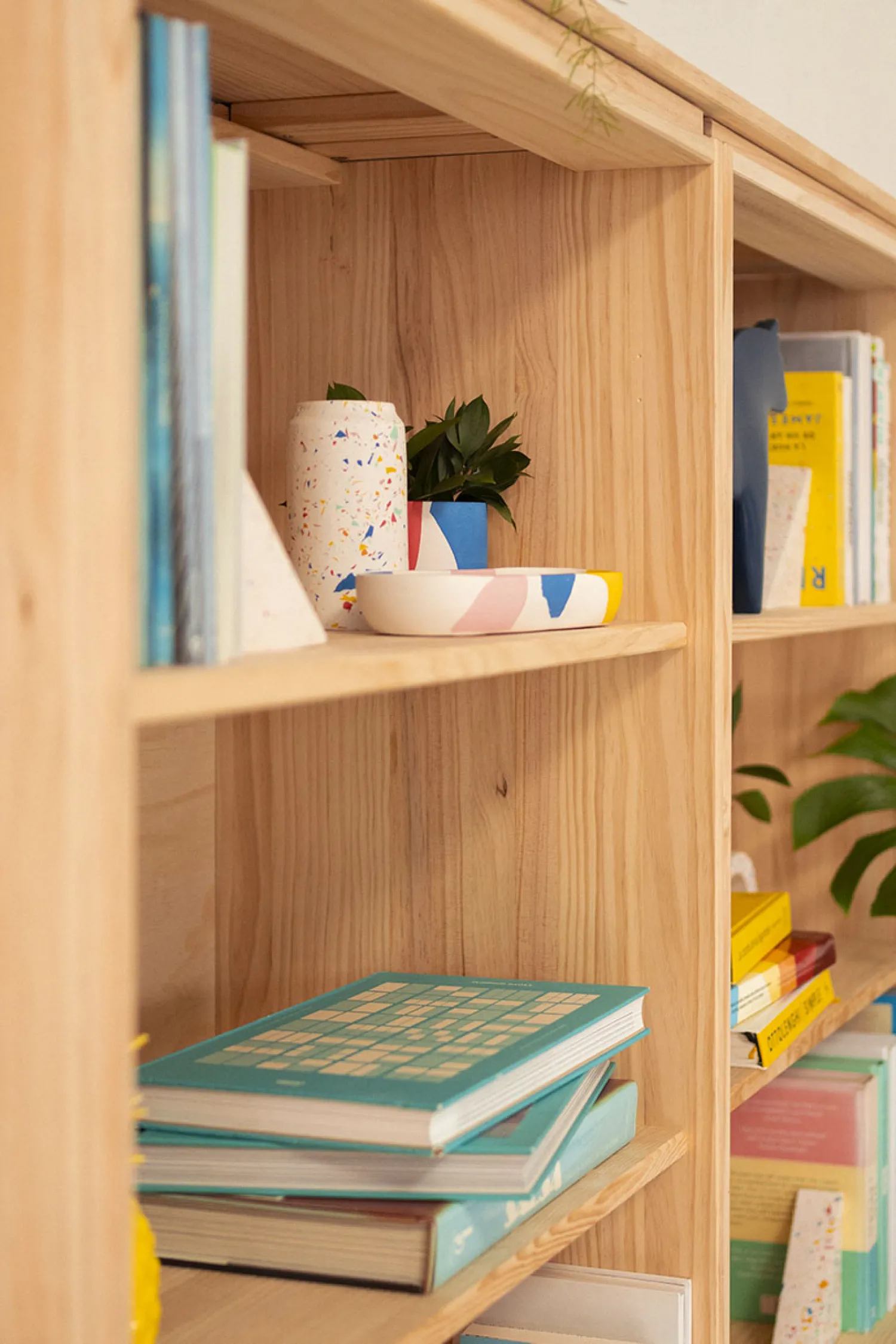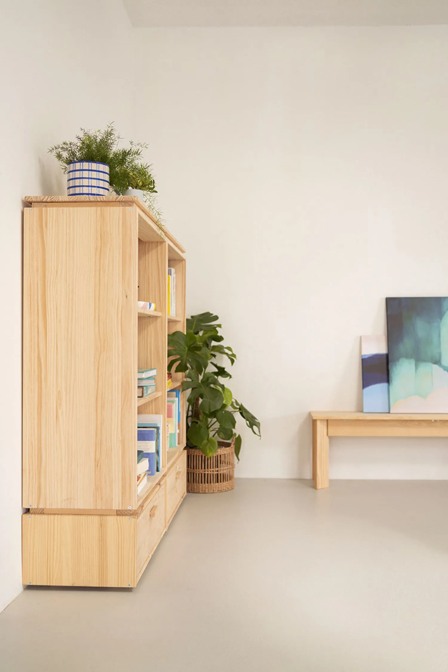 Estantería doble de madera natural con cajones de almacenaje para libros y objetos decorativos. Ideal para salas de estar o espacios de estudio y trabajo. Un mueble que combina funcionalidad y diseño ecológico, pensado para adaptarse a diferentes espacios de tu hogar. Organiza y almacena de forma eficiente, sin renunciar al estilo.