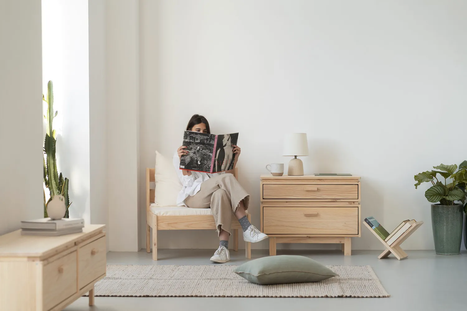Este es un mueble sostenible y reciclable con certificación PEFC. Fabricado con madera maciza ecológica de pino insignis, procedente de bosques locales y sostenibles.