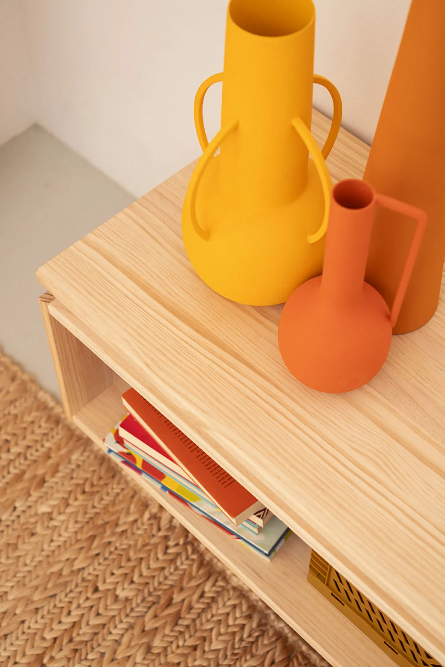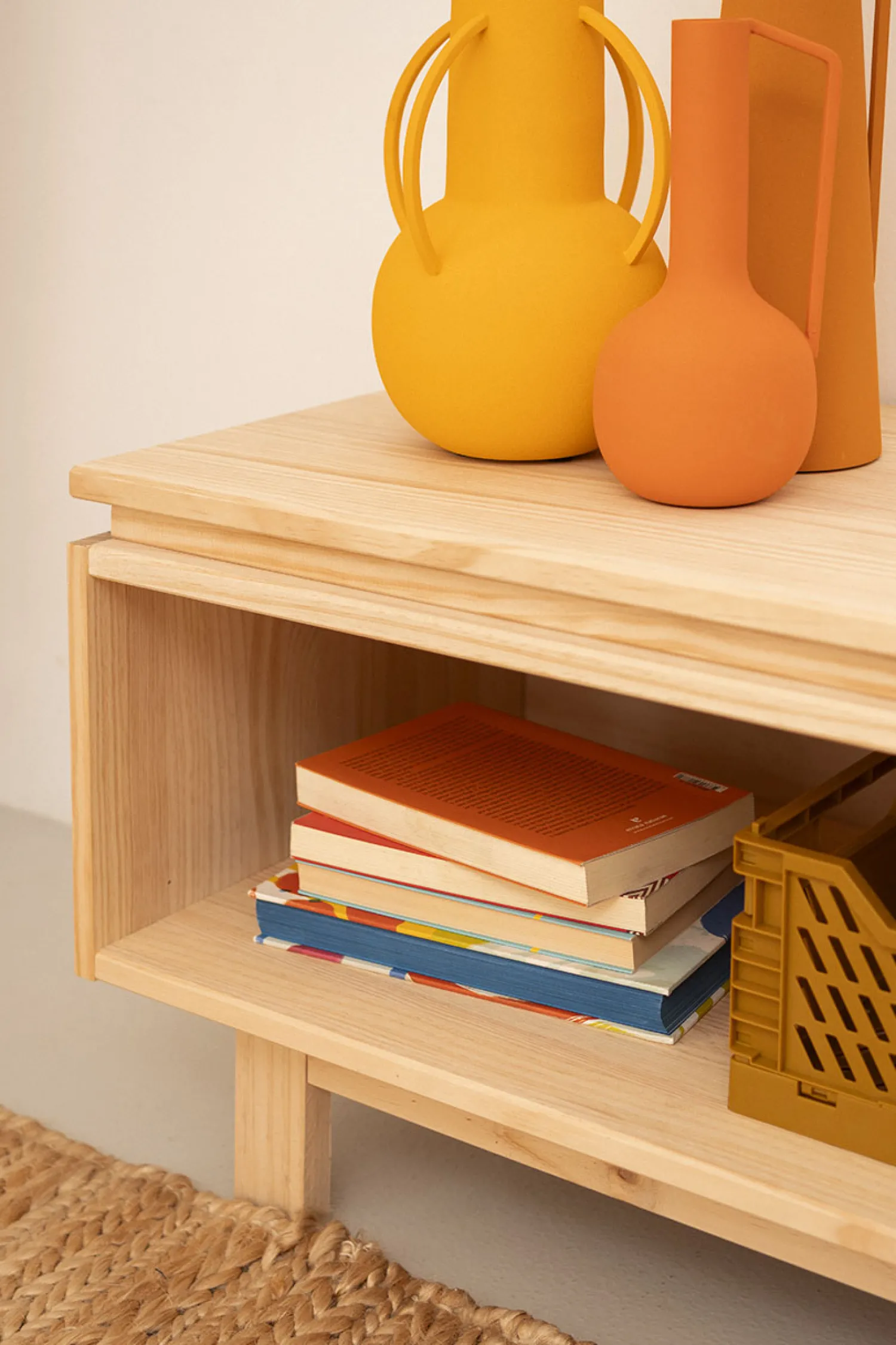 Mueble bajo de TV fabricado con madera ecológica y natural, con una amplia encimera y dos huecos de almacenaje para cajas o cestas. Este mueble combina funcionalidad y diseño para adaptarse a diferentes espacios de tu hogar. Fabricado con madera ecológica certificada, permite organizar y almacenar de forma eficiente, mientras mantiene un estilo fresco y atemporal.