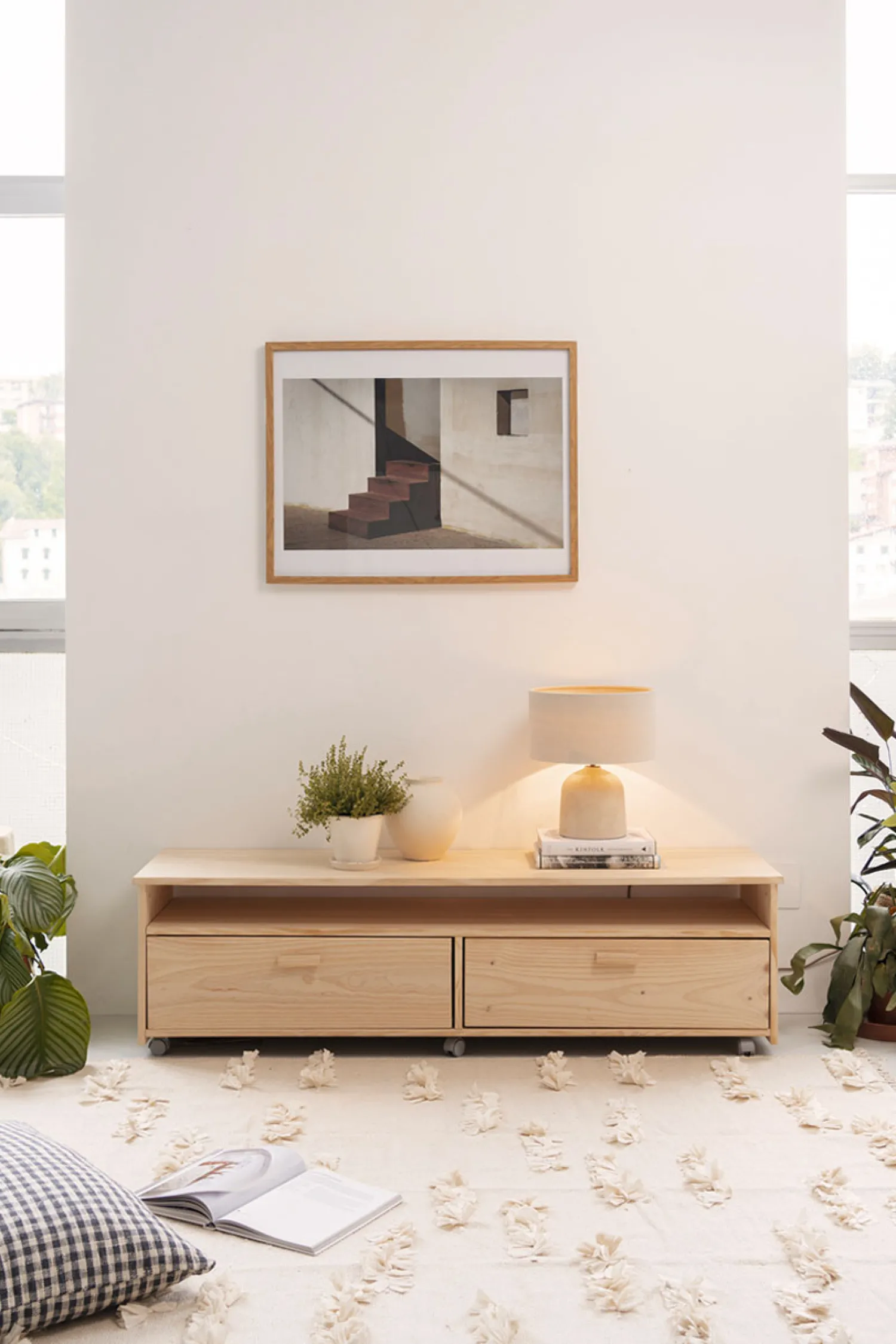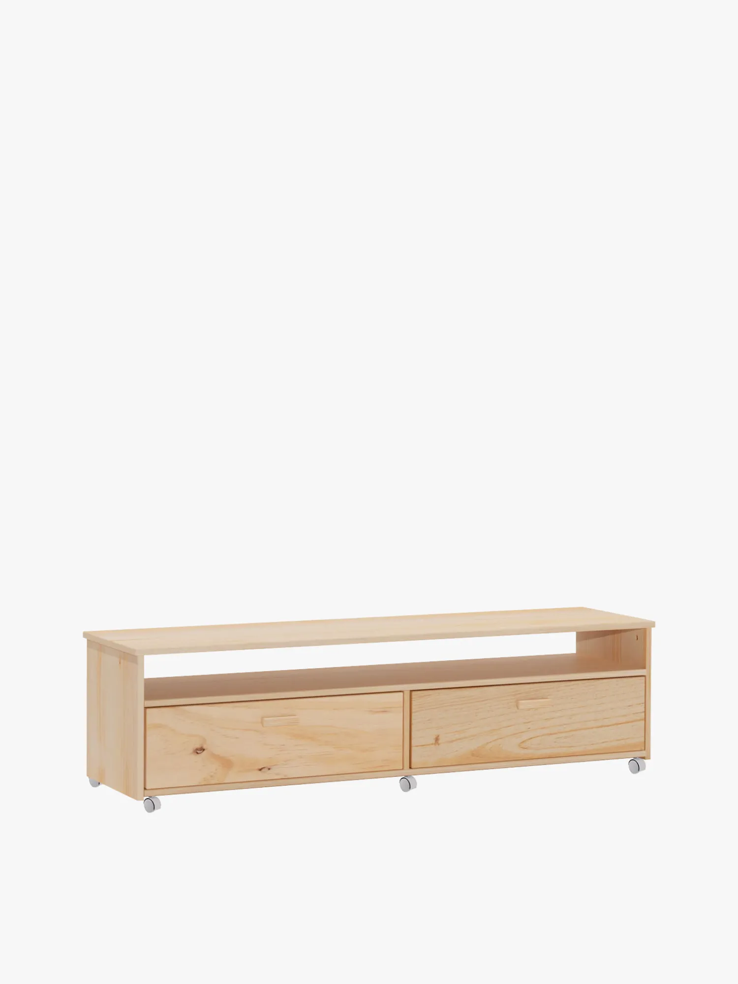 Mueble para TV de madera natural con dos amplios cajones para guardar juegos, mantelería o mantas de sofá y un hueco para los elementos multimedia. Además, la encimera incluye un hueco para los cables y en la parte inferior 4 ruedas para mover el mueble de TV con facilidad.
