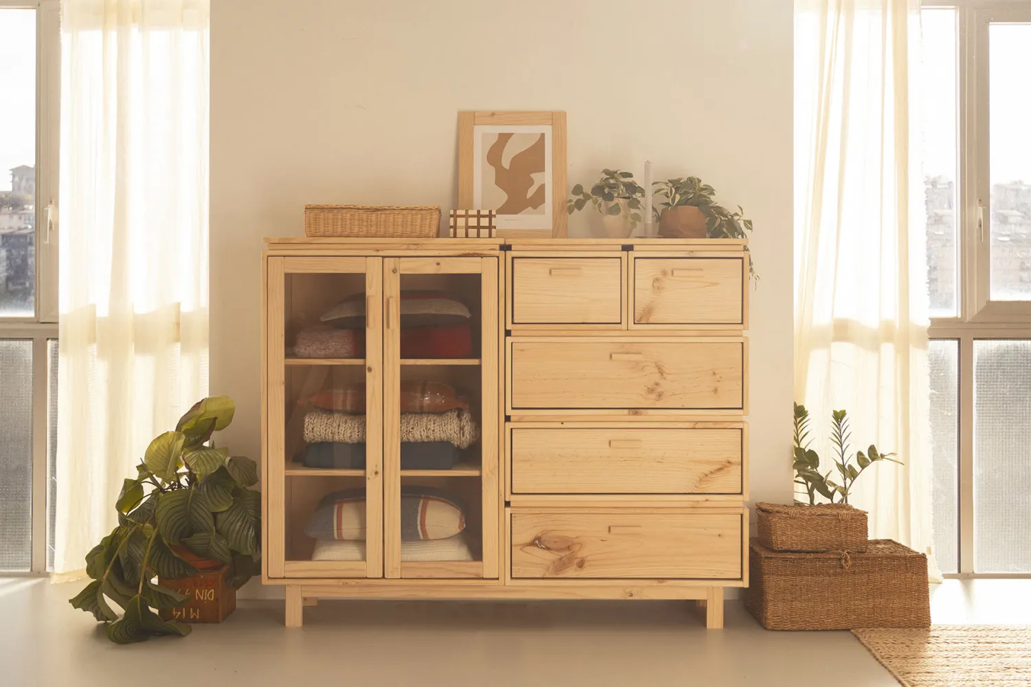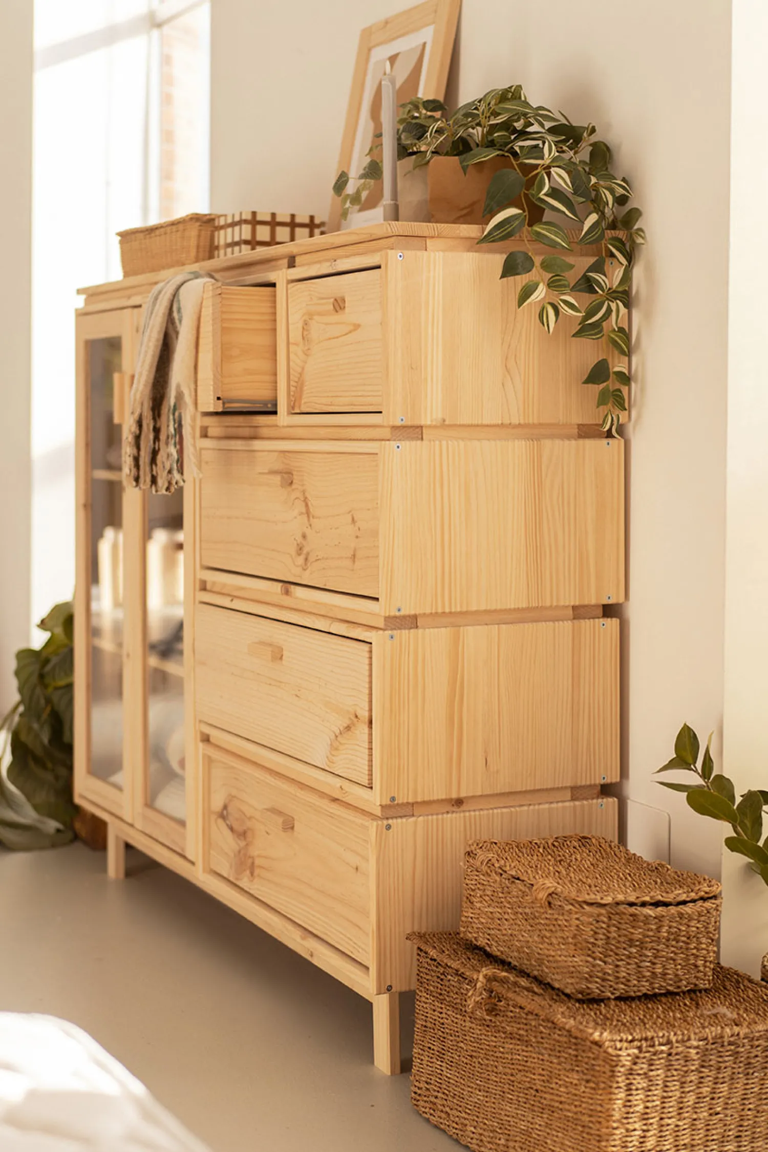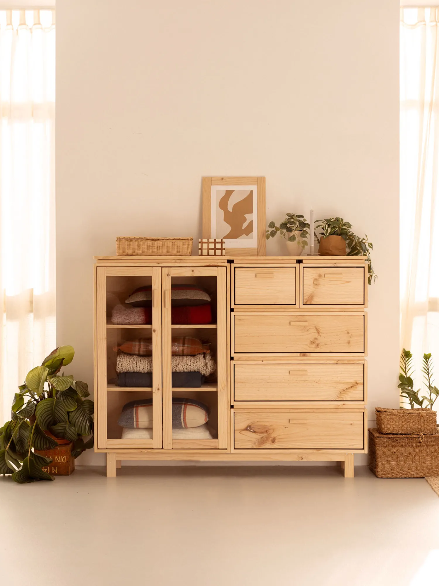 Mueble de almacenaje con armario vitrina y cómoda integrada de seis cajones. Un mueble de madera maciza apto para salas de estar, dormitorios, comedores o como despensa en la cocina.