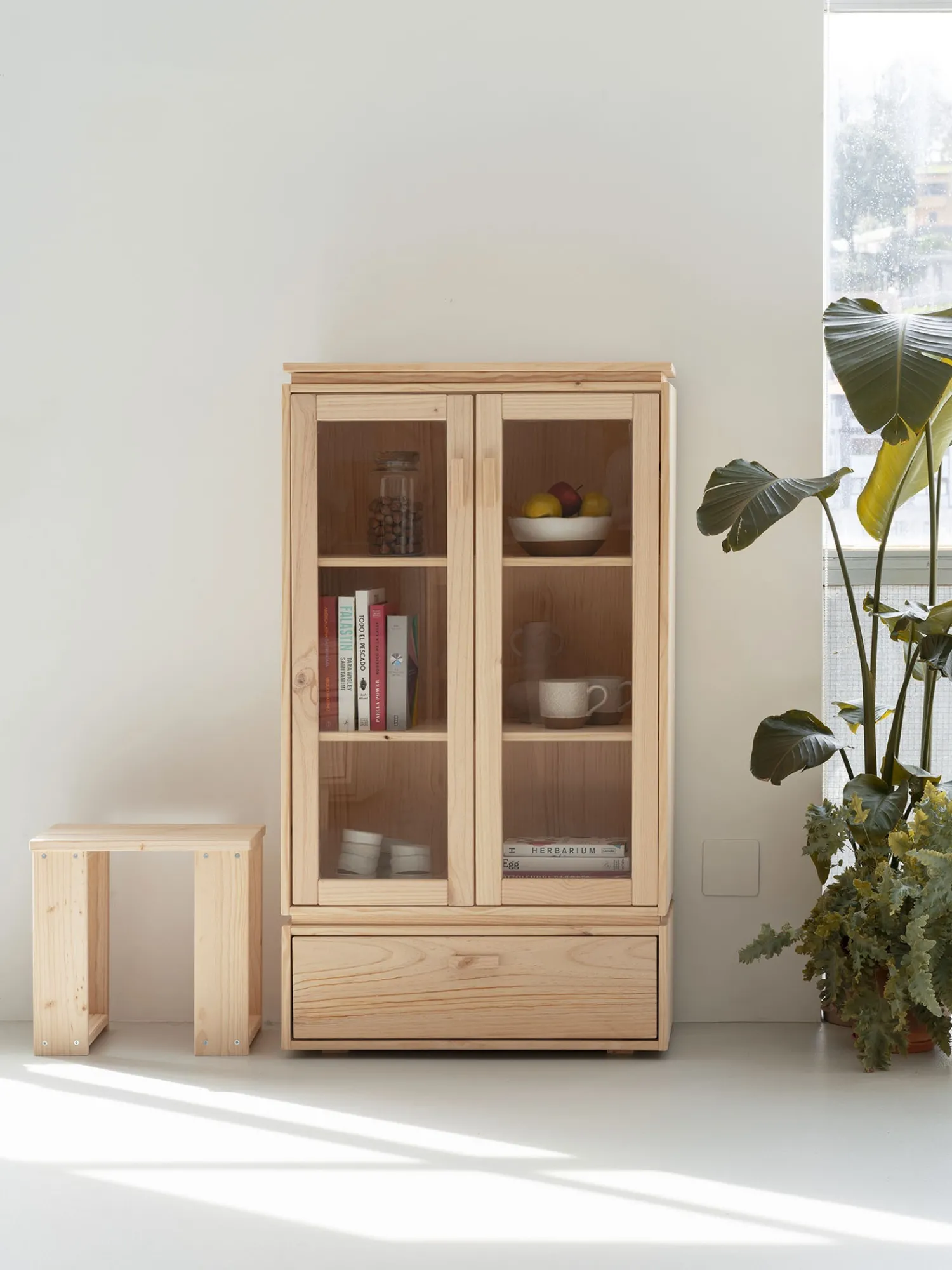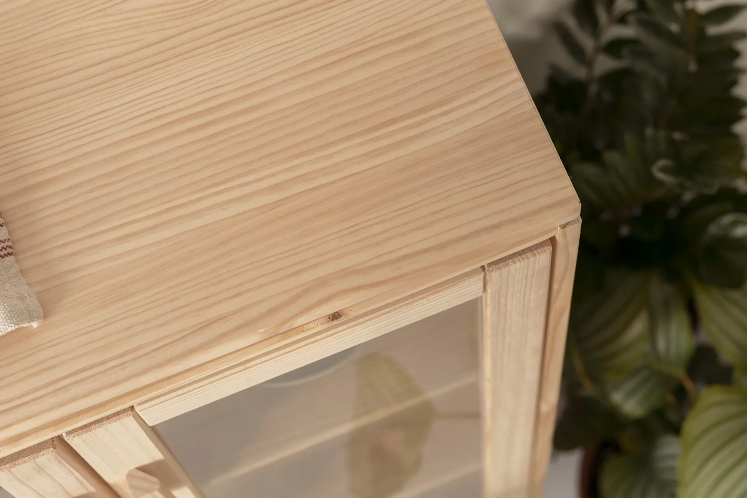 Vitrina de madera de pino natural. Un mueble de diseño con gran capacidad de almacenaje. Con un cajón con rieles integrados y dos puertas acristaladas, para decorar la sala de estar o como despensa en la cocina.