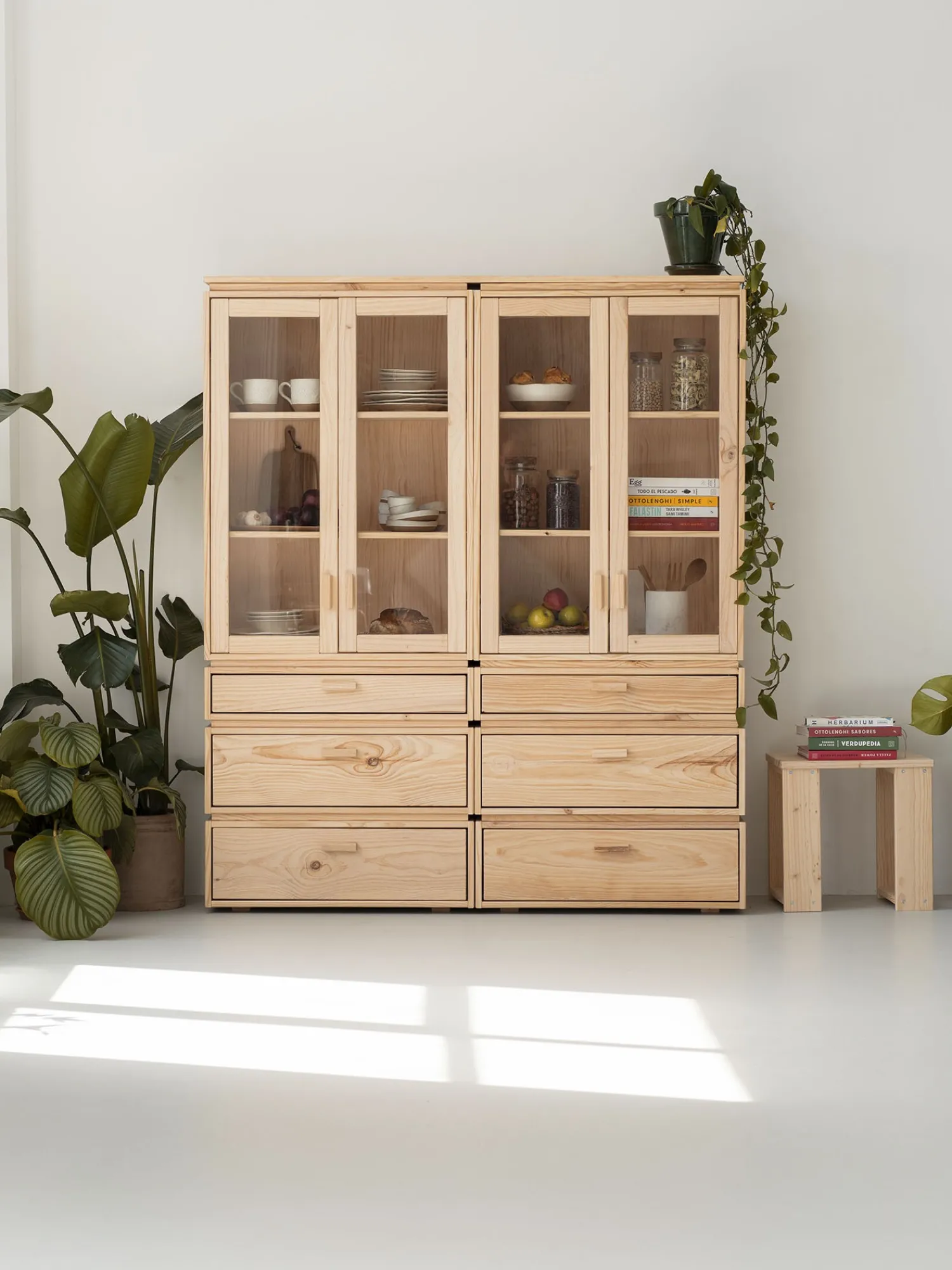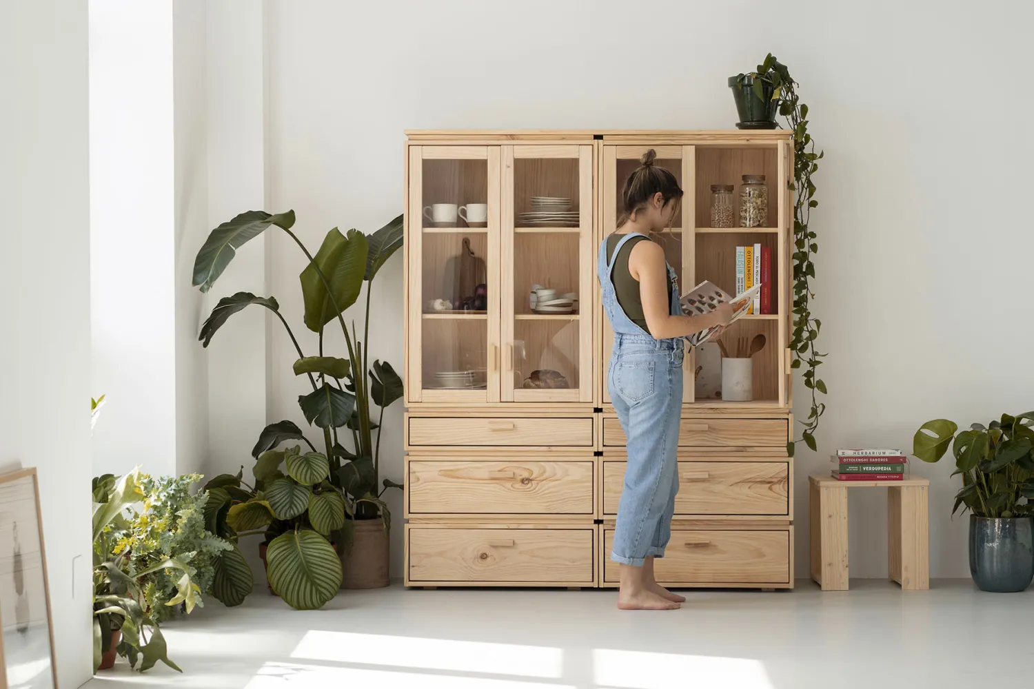 Este es un mueble sostenible y reciclable con certificación PEFC. Fabricado con madera maciza ecológica de pino insignis, procedente de bosques locales y sostenibles.